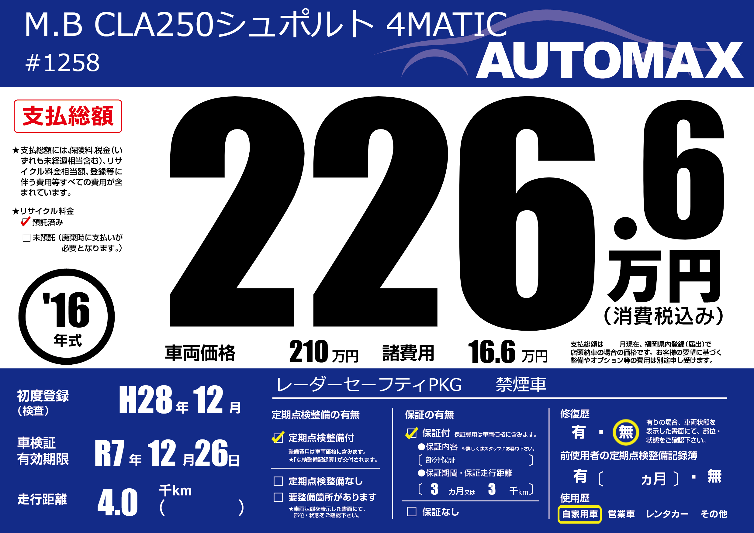| 車名 | M.B CLA250シュポルト 4MATIC | グレード ミッション 排気量 |