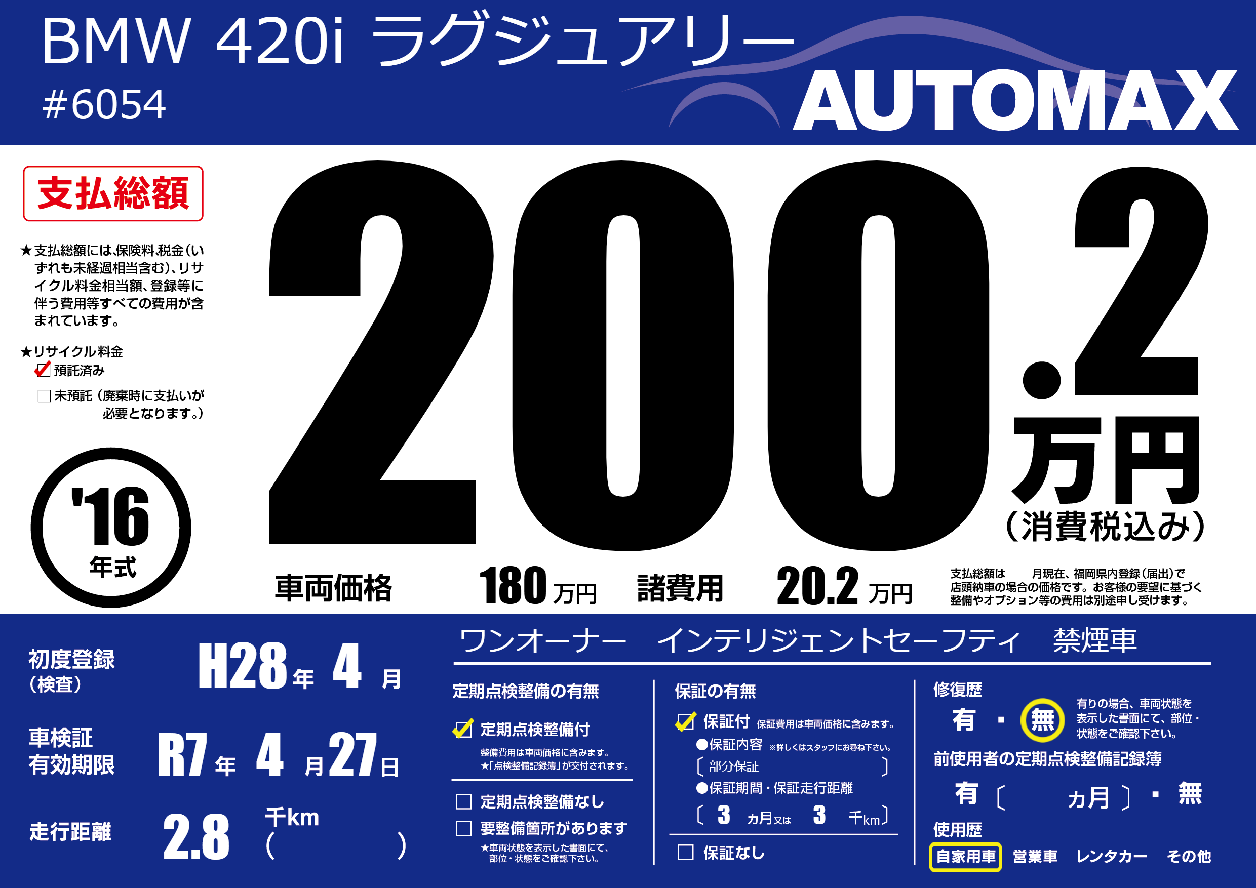 | 車名 | BMW 420i ラグジュアリー | グレード ミッション 排気量 |