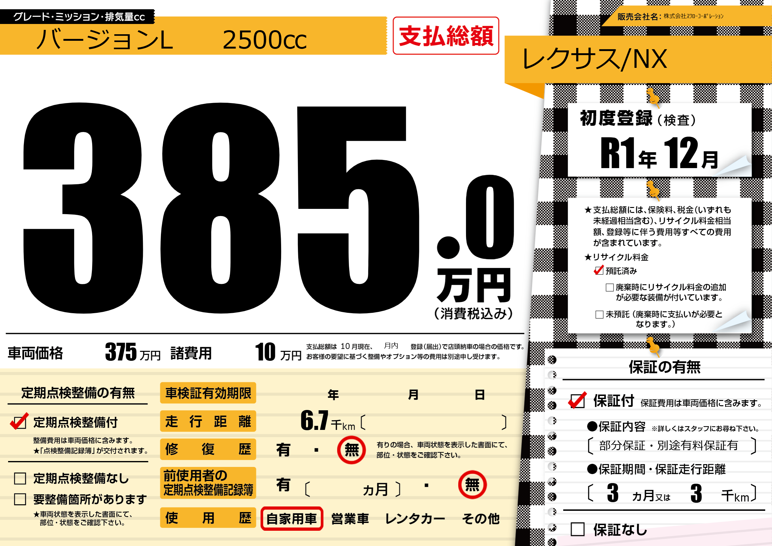 | 車名 | レクサス/NX | グレード ミッション 排気量 |