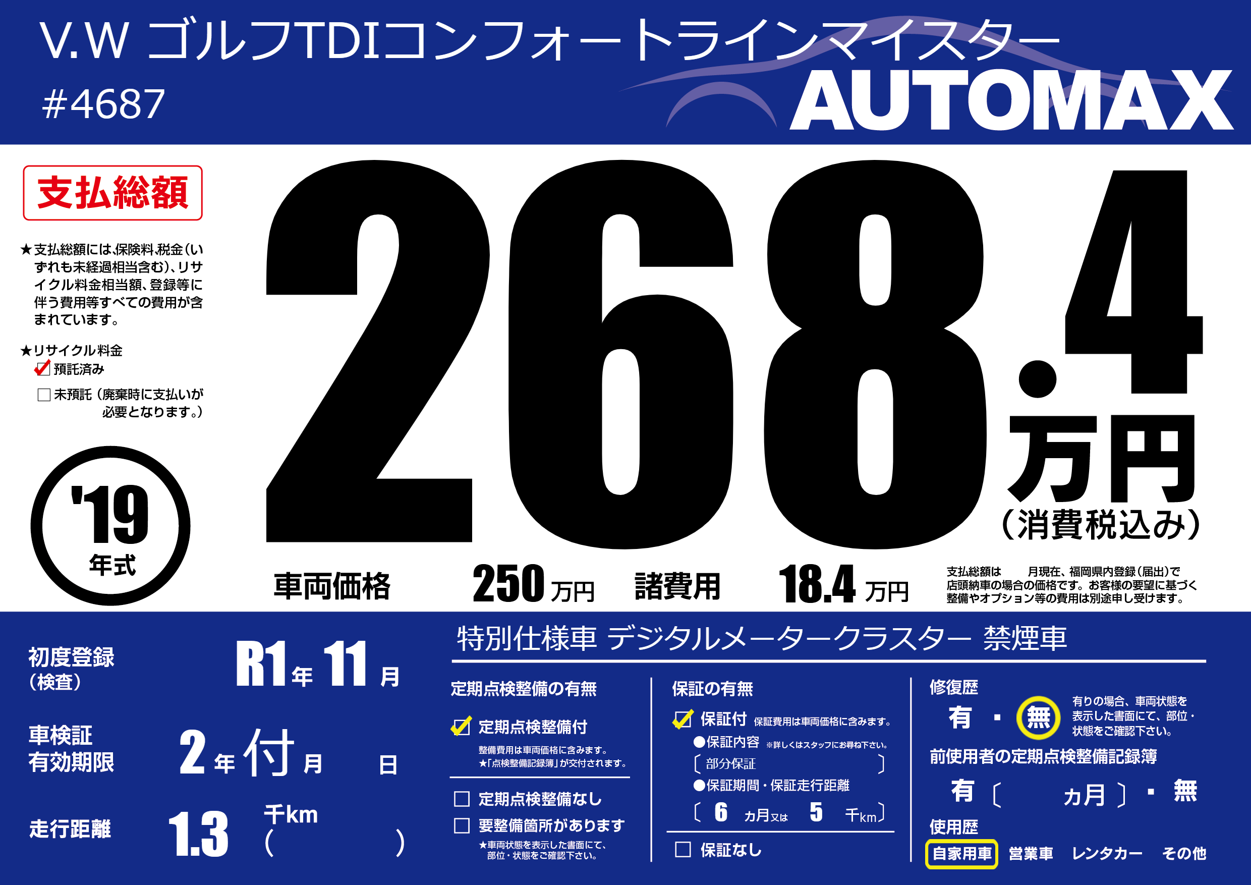 | 車名 | V.W ゴルフTDIコンフォートラインマイスター | グレード ミッション 排気量 |