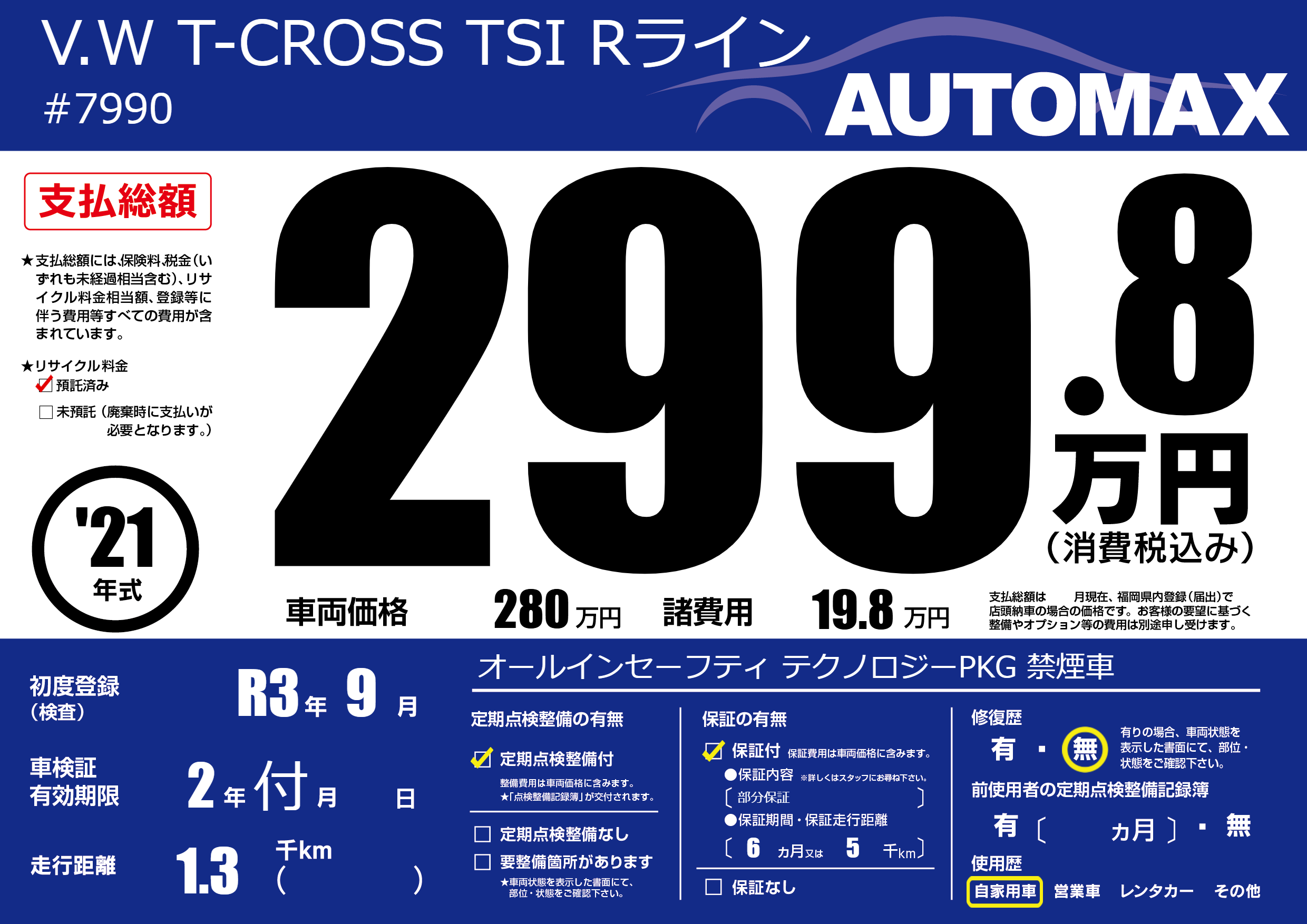 | 車名 | V.W T-CROSS TSI Rライン | グレード ミッション 排気量 |