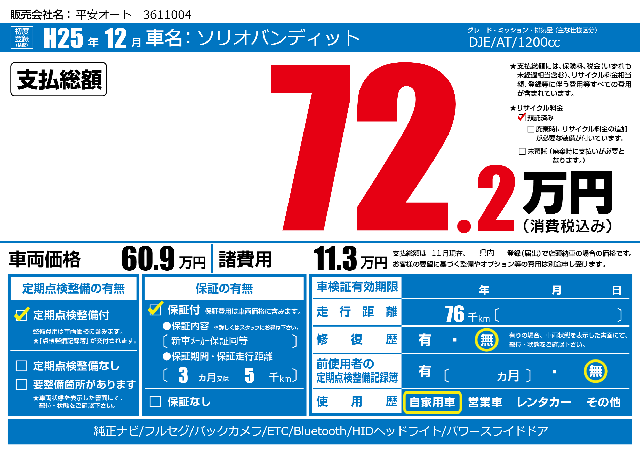 | 車名 | ソリオバンディット | グレード ミッション 排気量 |