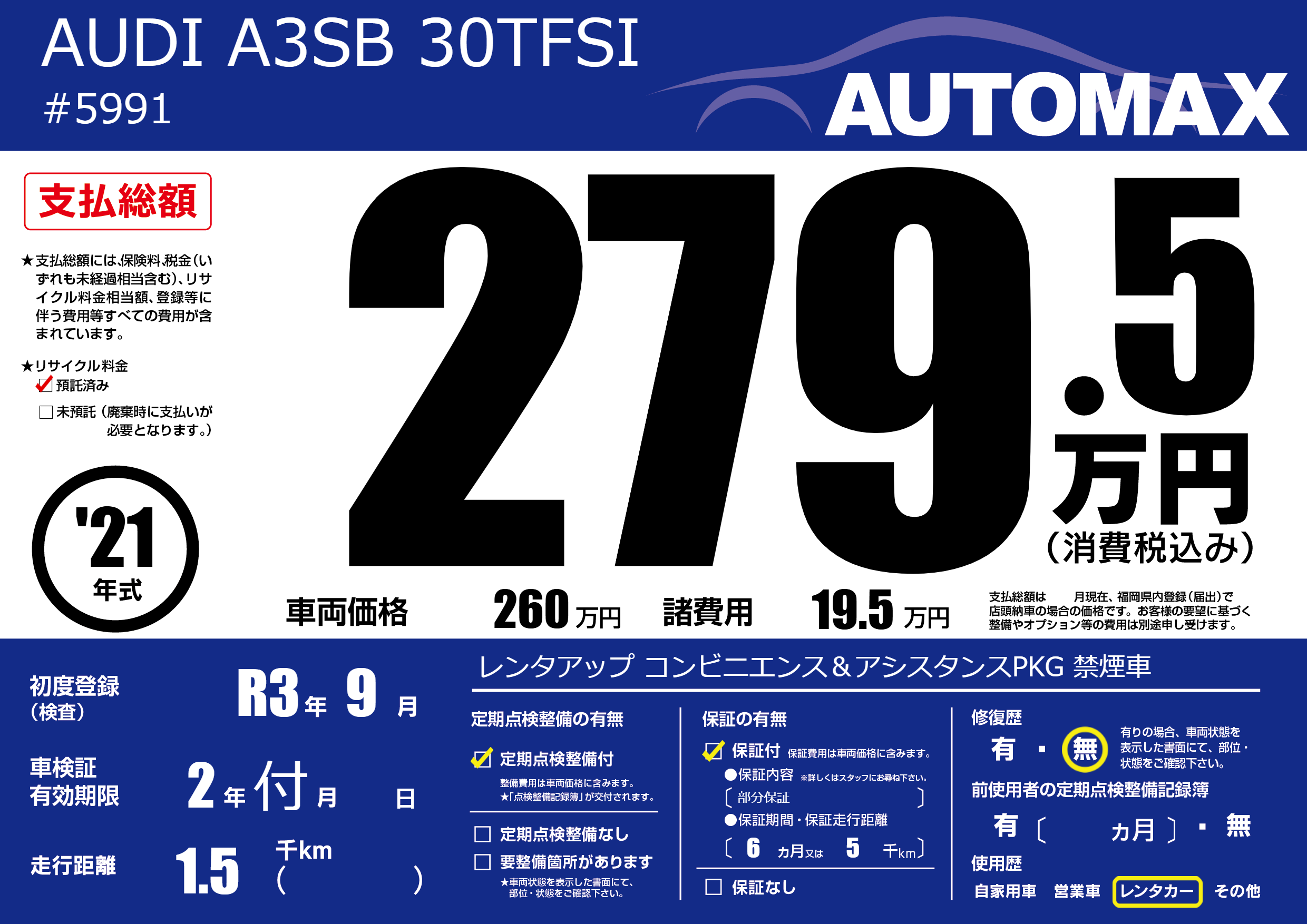 保証付き 保証内容(部分保証) 6ヶ月または(5)千kmまで |