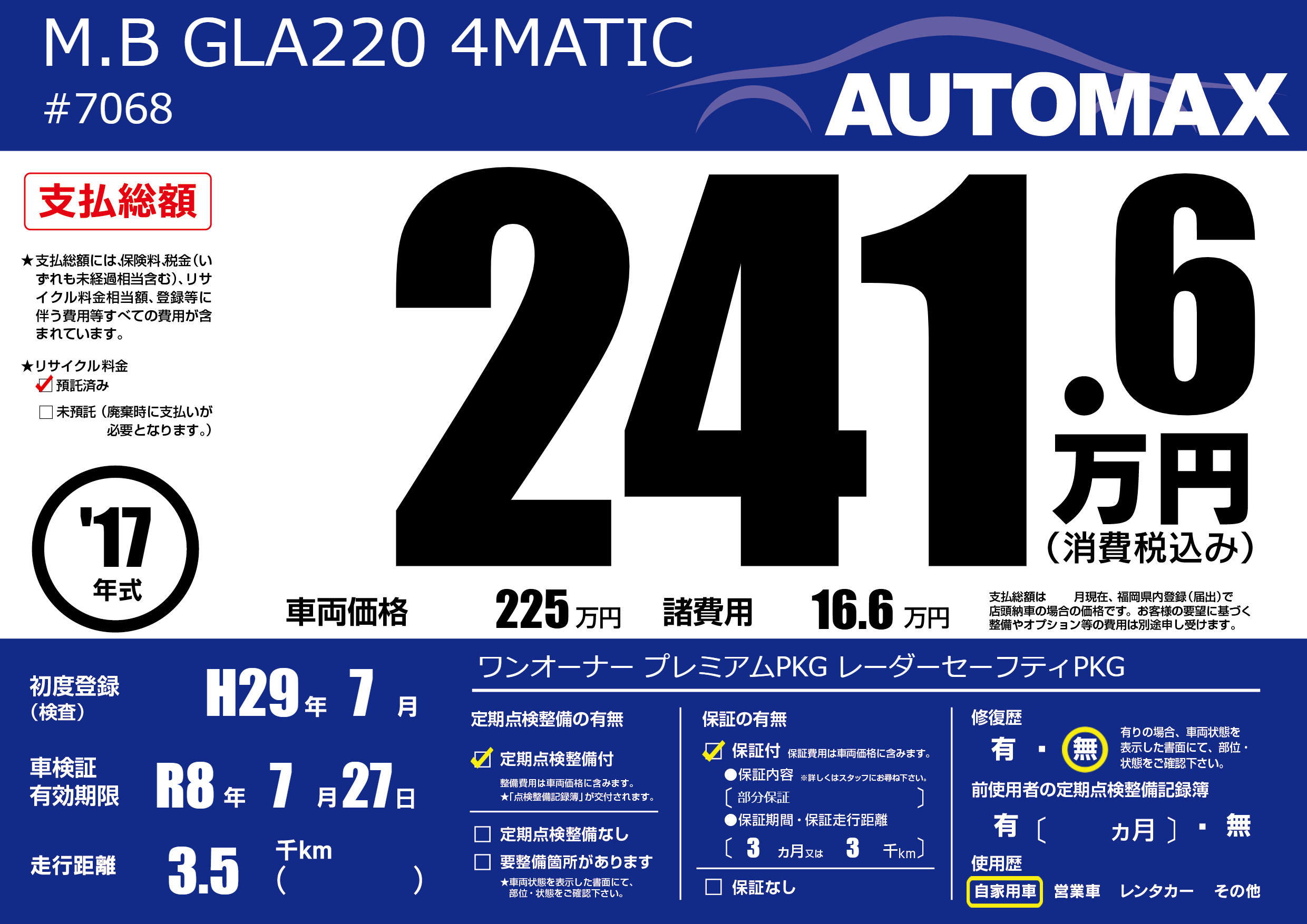 | 車名 | M.B GLA220 4MATIC | グレード ミッション 排気量 |