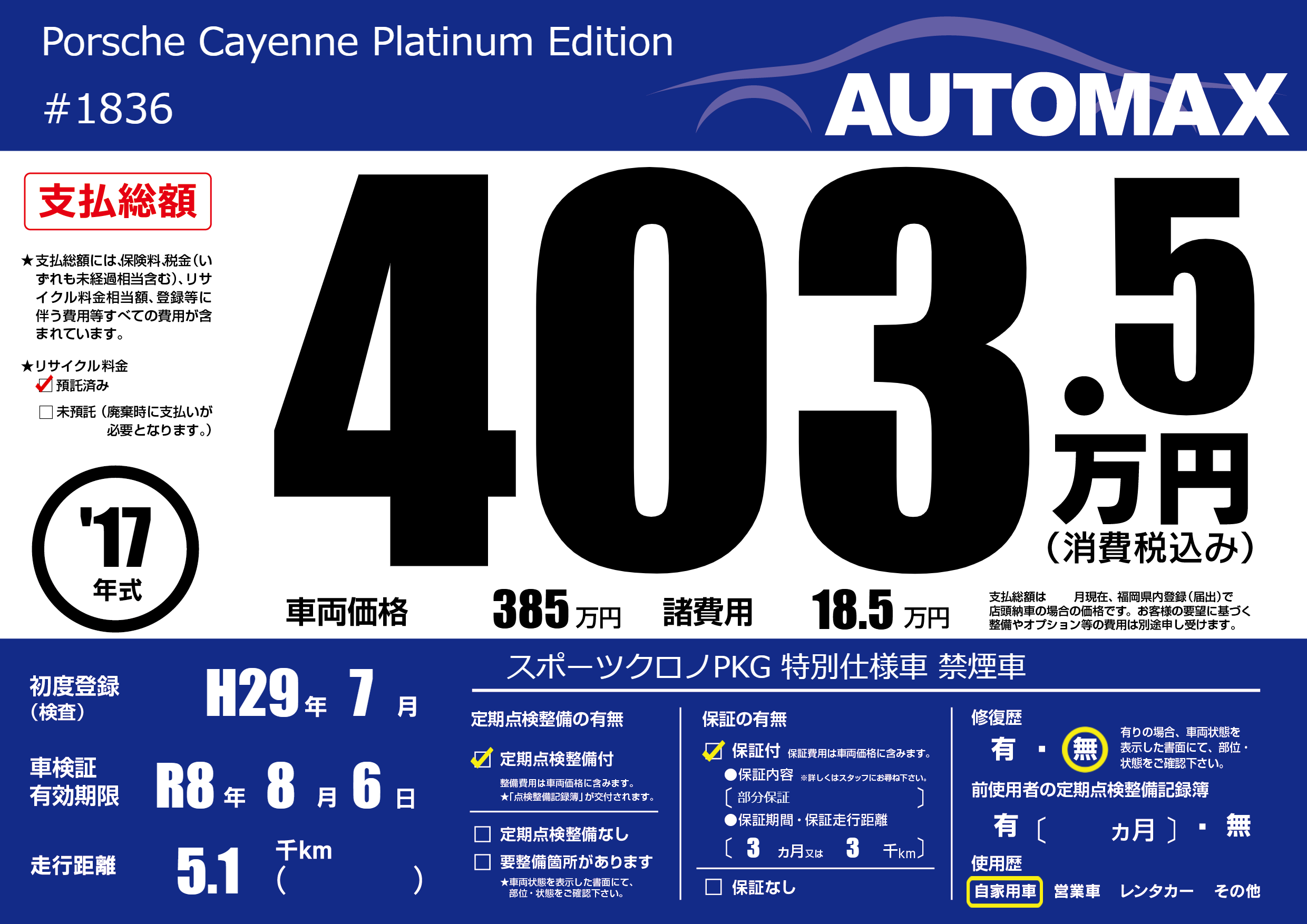 | 車名 | Porsche Cayenne Platinum Edition | グレード ミッション 排気量 |
