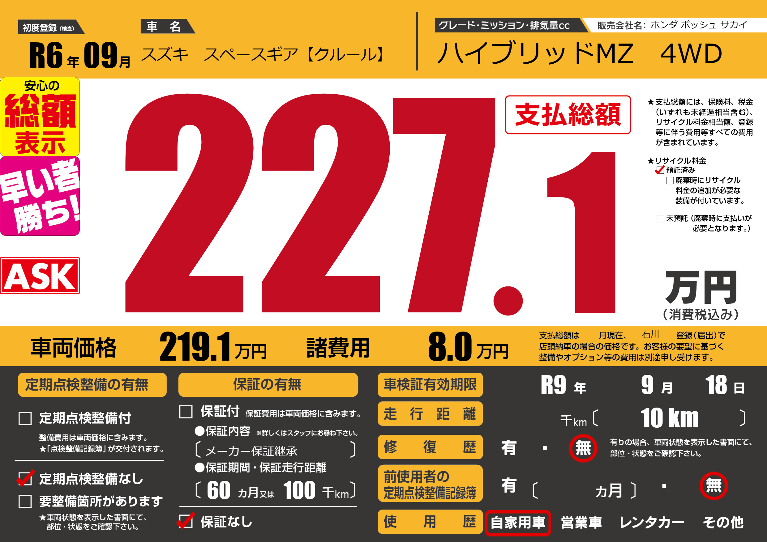 | 走行キロ | - | 初年度登録 | R6年09月 |