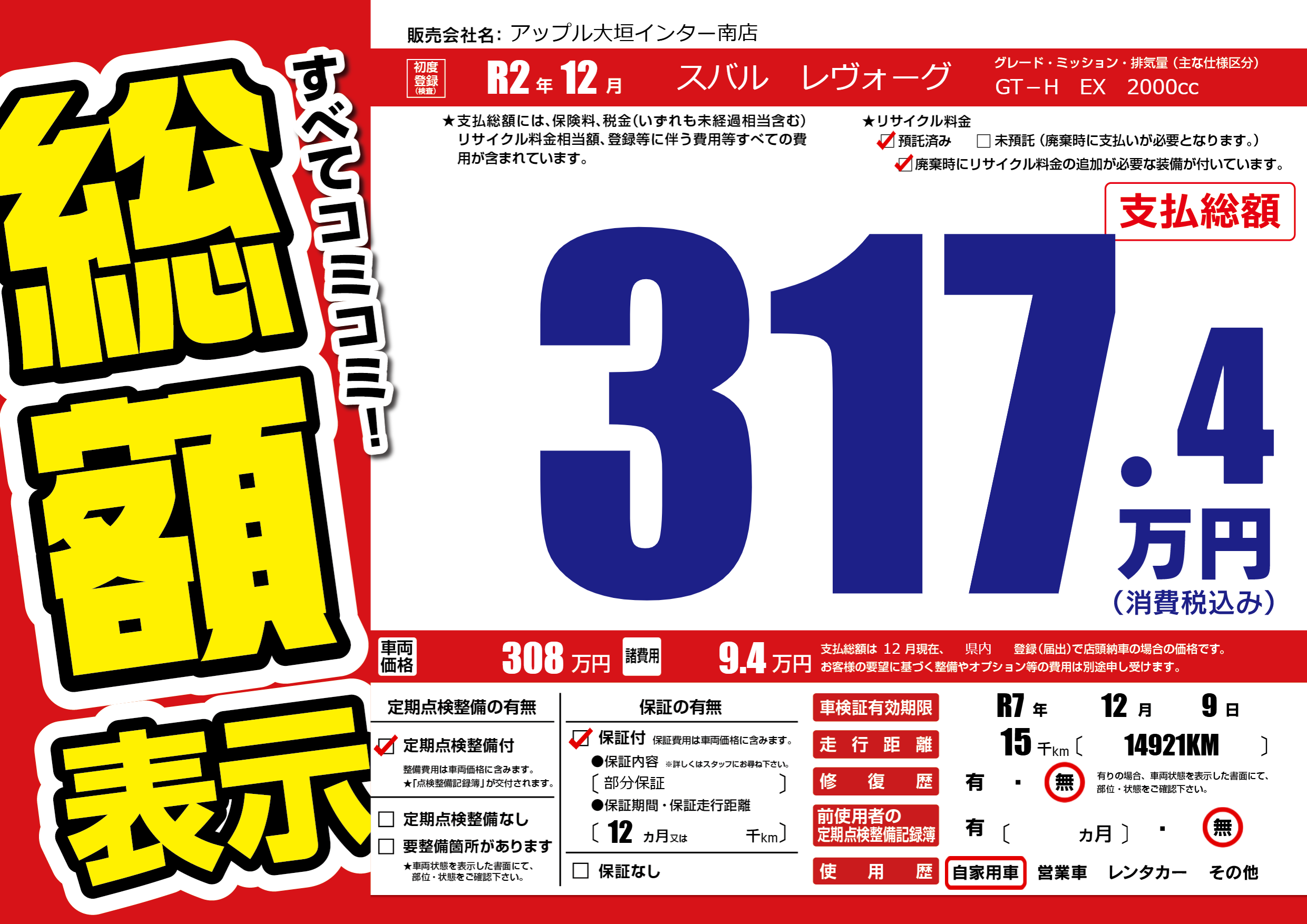 | 車名 | スバル レヴォーグ | グレード ミッション 排気量 |