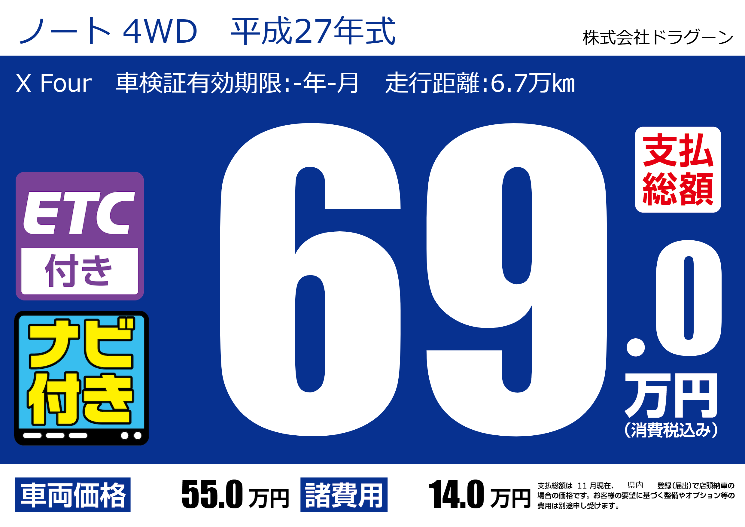 | 車名 | ノート 4WD 平成27年式 | グレード ミッション 排気量 |