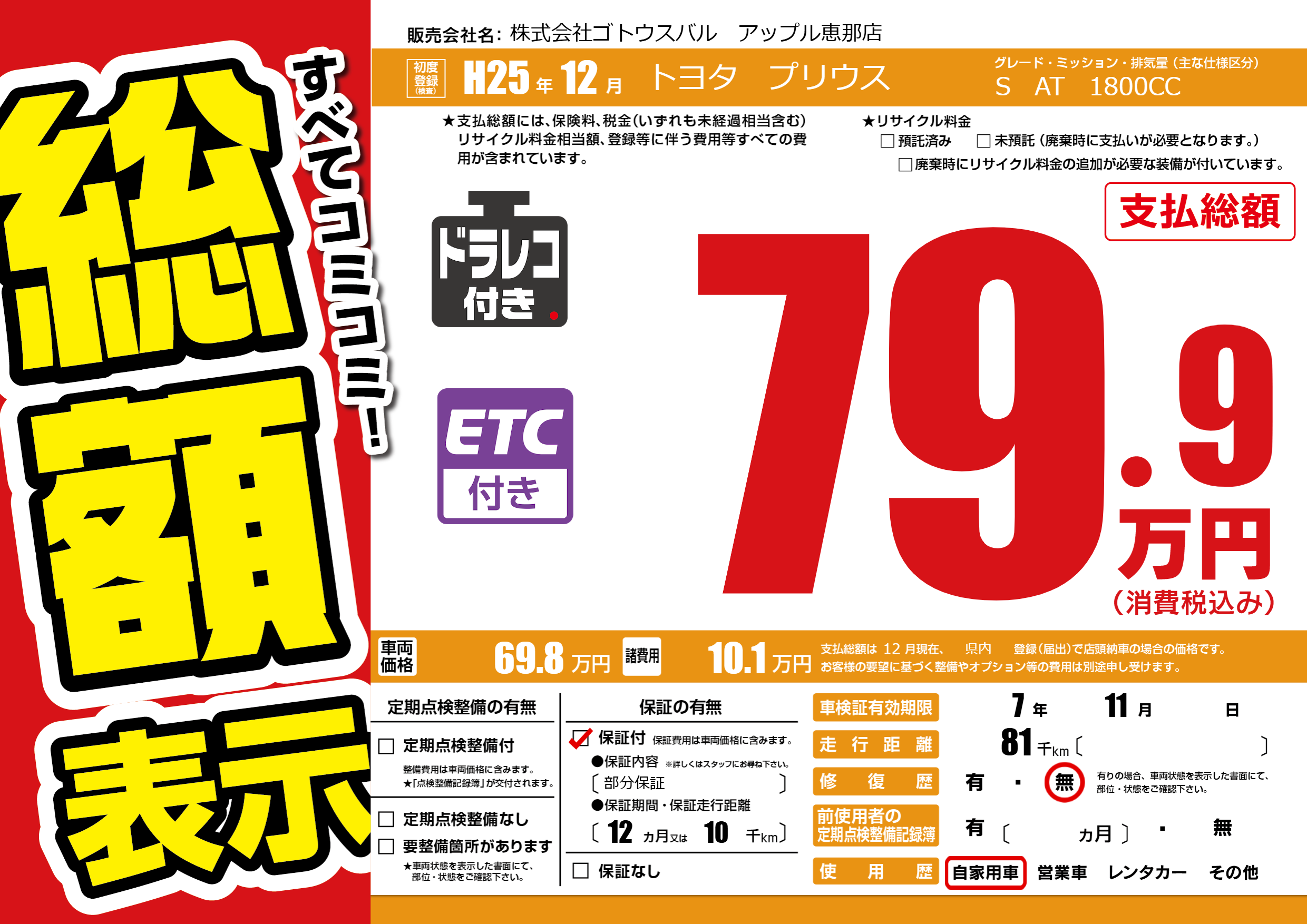 | 車名 | トヨタ プリウス | グレード ミッション 排気量 |