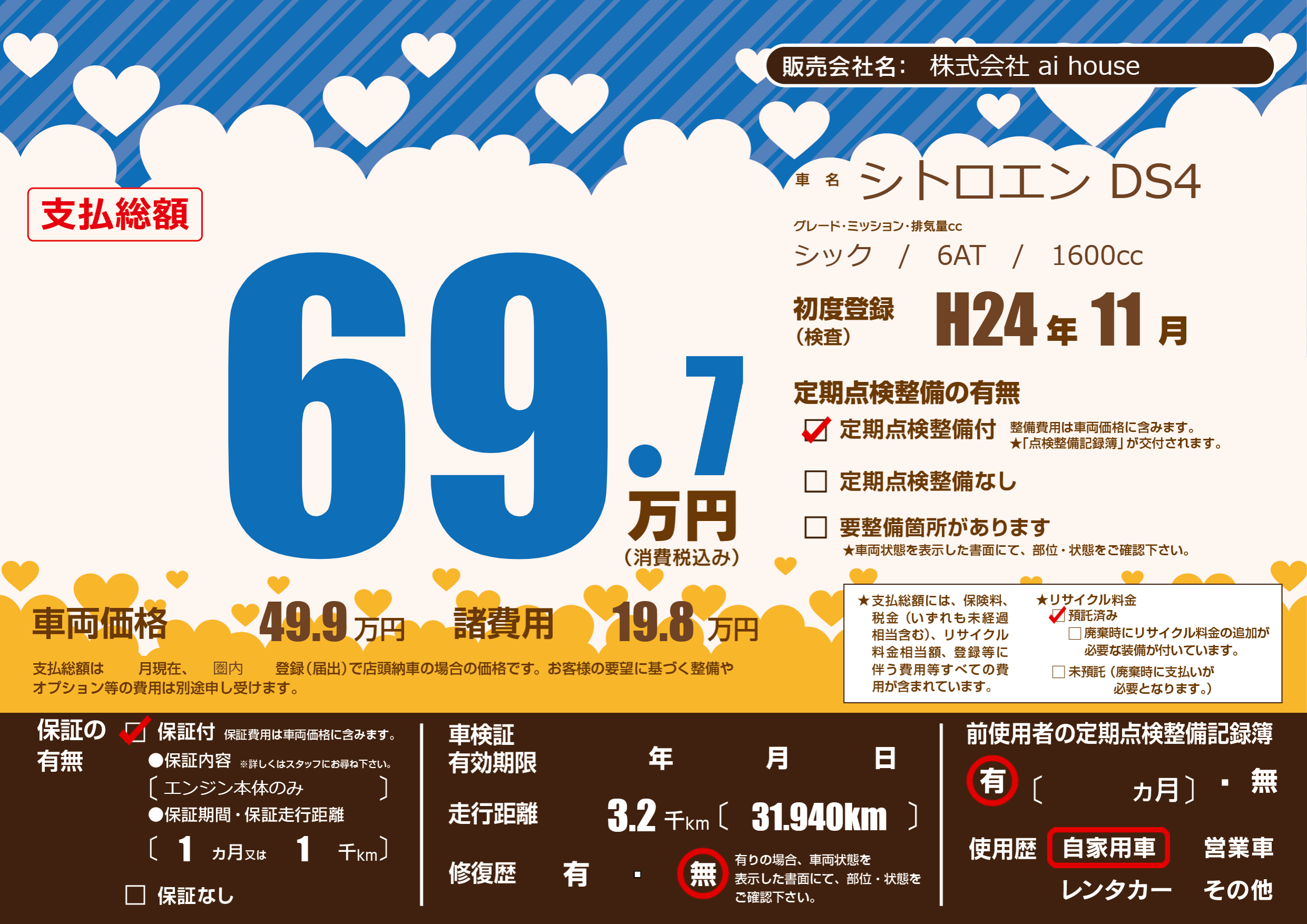 | 車名 | シトロエン DS4 | グレード ミッション 排気量 |