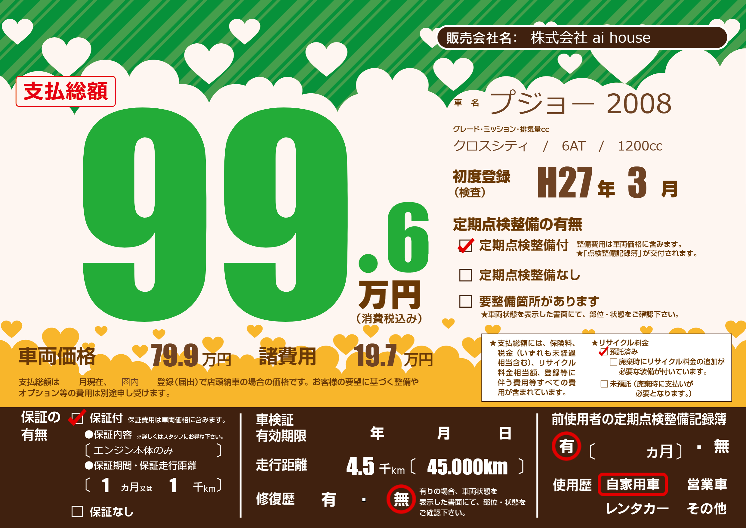 | 走行キロ | 0.4万km | 初年度登録 | H27年3月 |