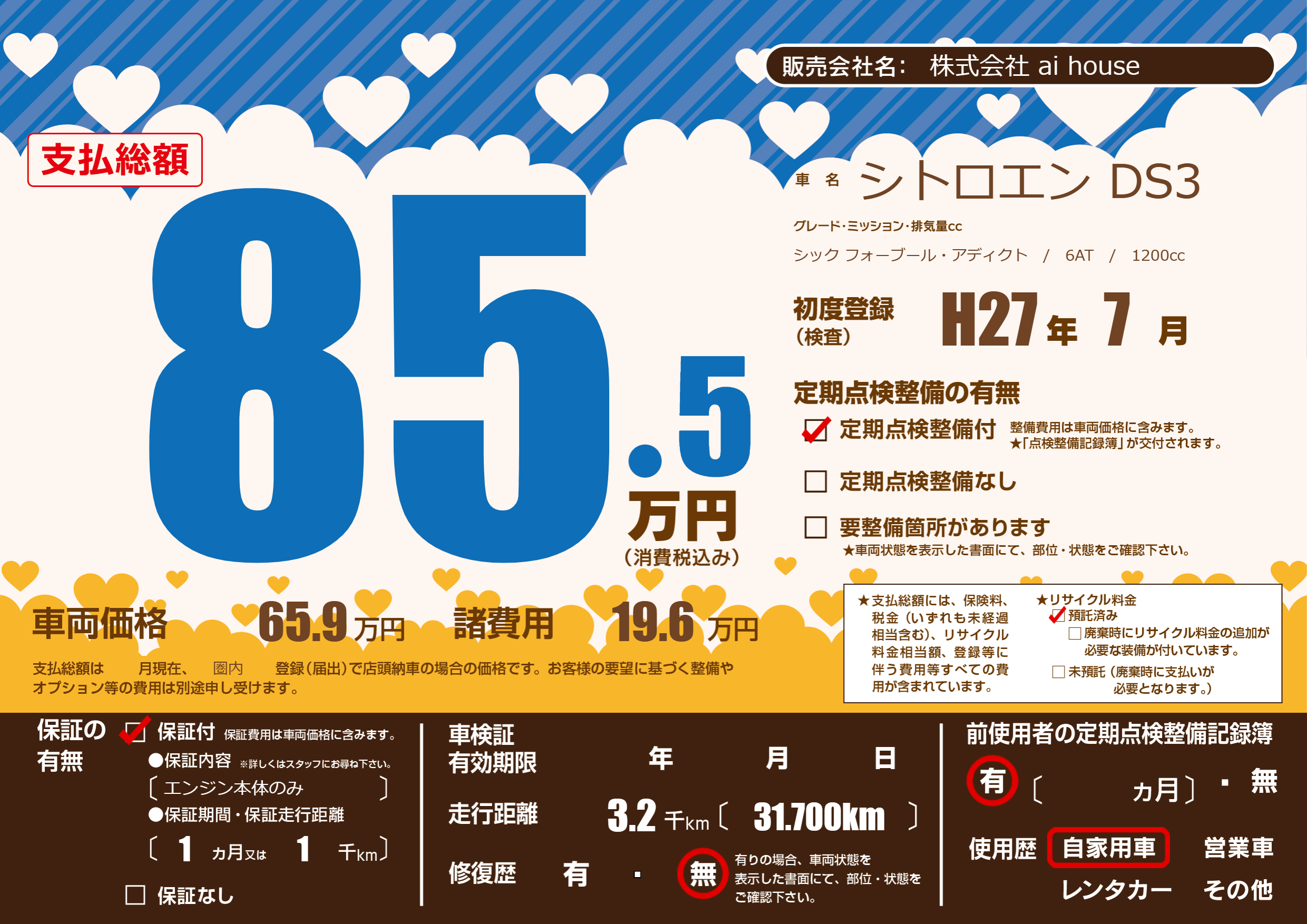 | 車名 | シトロエン DS3 | グレード ミッション 排気量 |