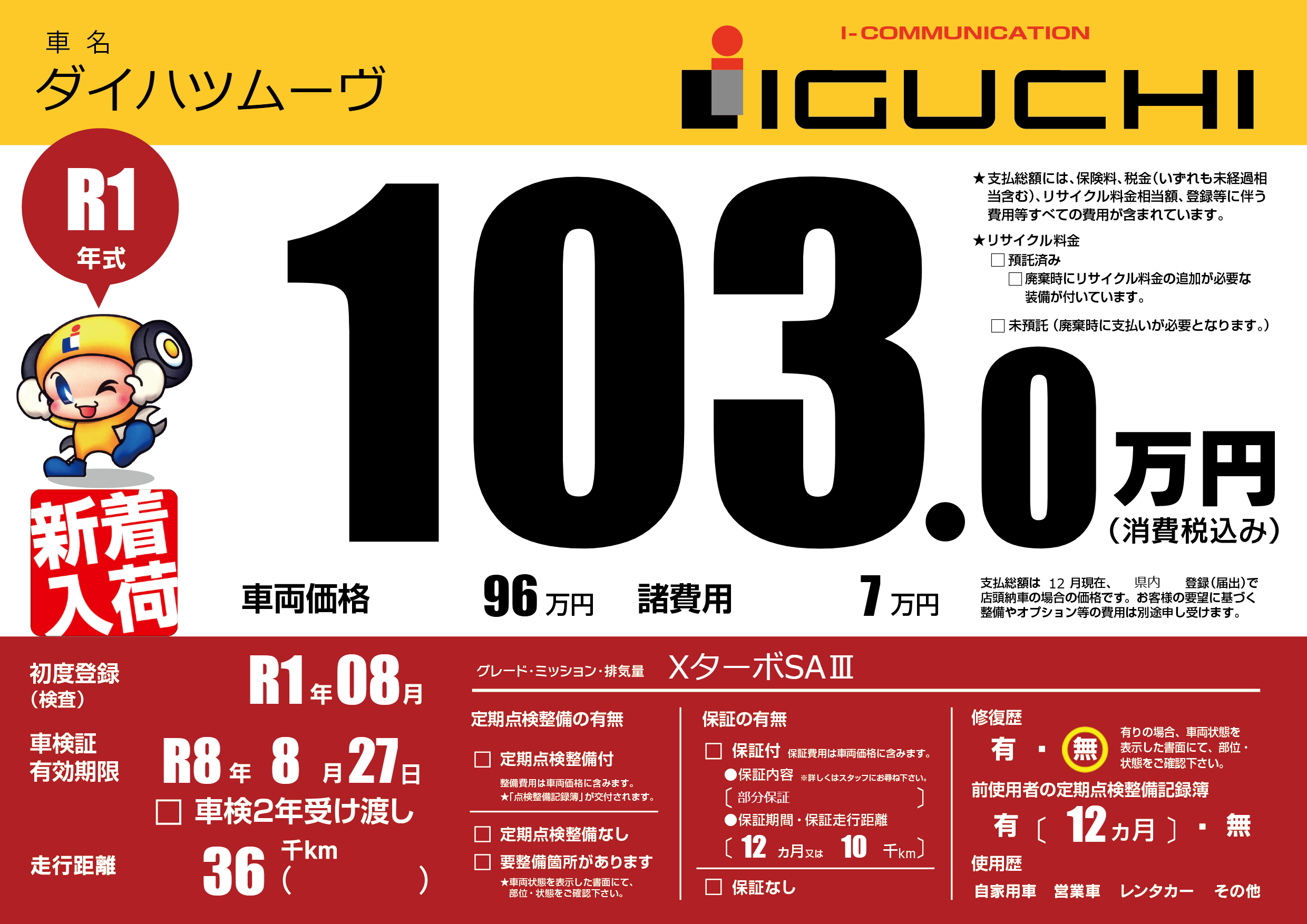 | 車名 | ダイハツムーヴ | グレード ミッション 排気量 |