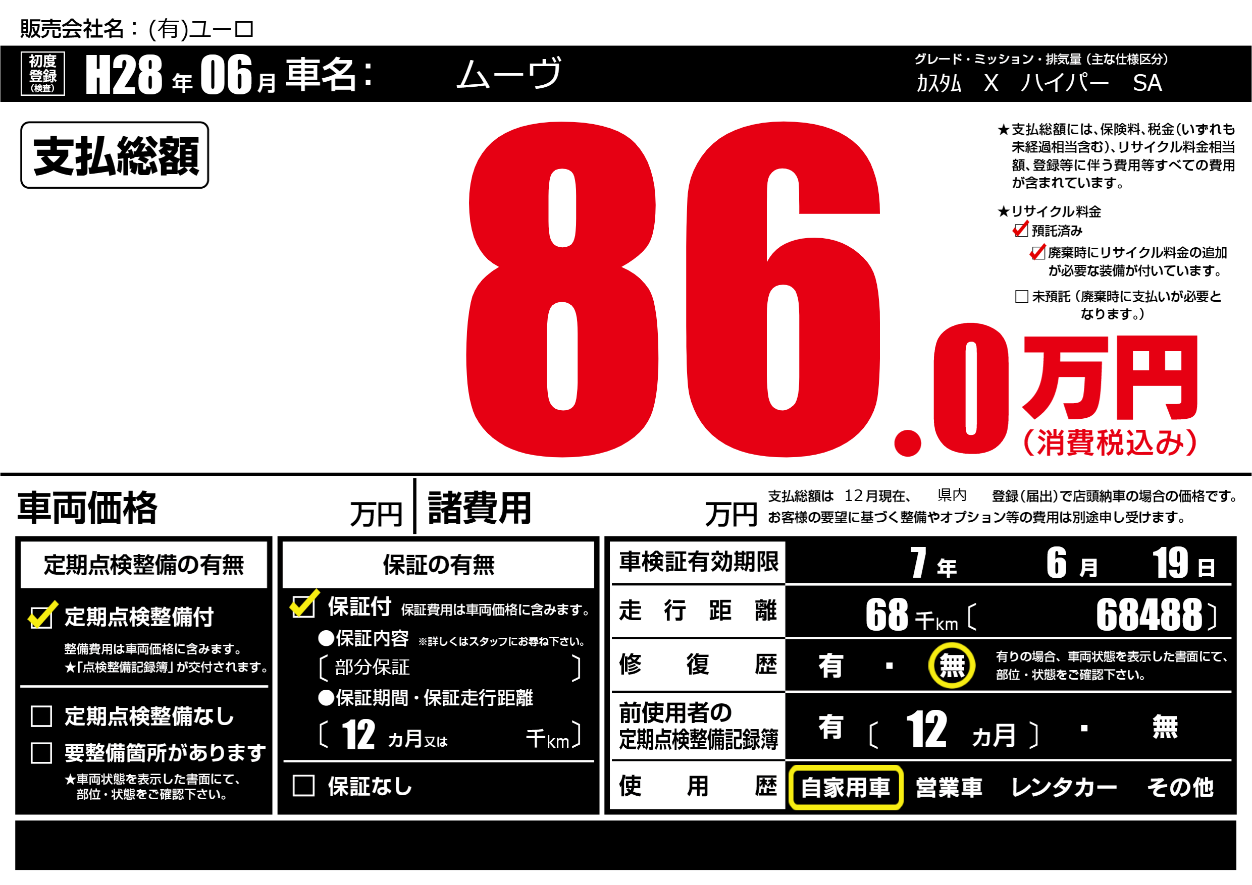 | 走行キロ | 6.8万km | 初年度登録 | H28年06月 |