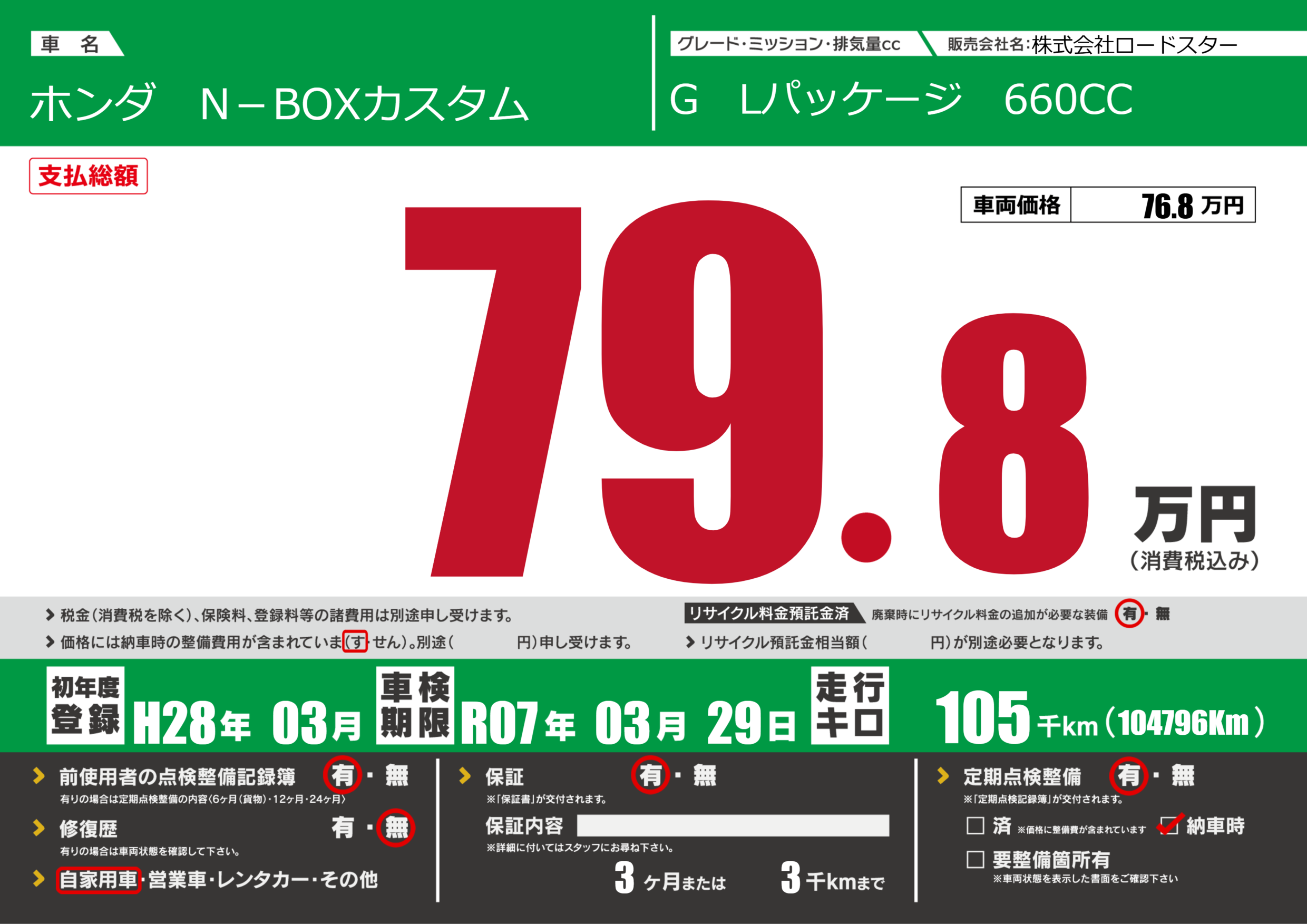 | 定期点検整備 | 定期点検整備あり 納車時あり | ||