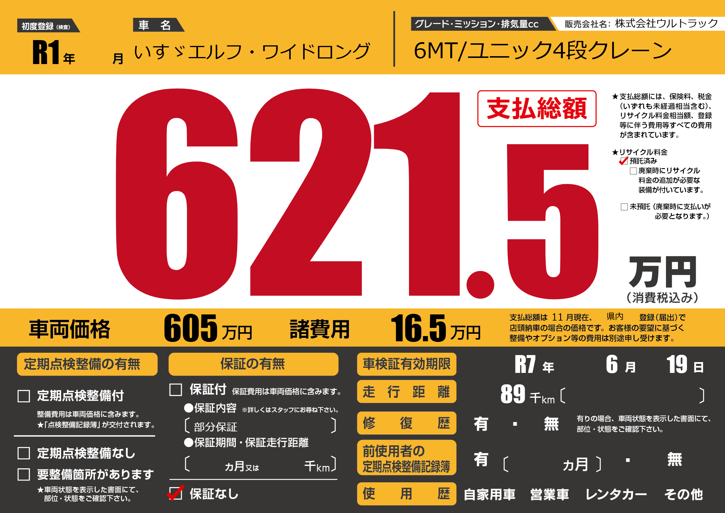 | 走行キロ | 8.9万km | 初年度登録 | R1年---月 |