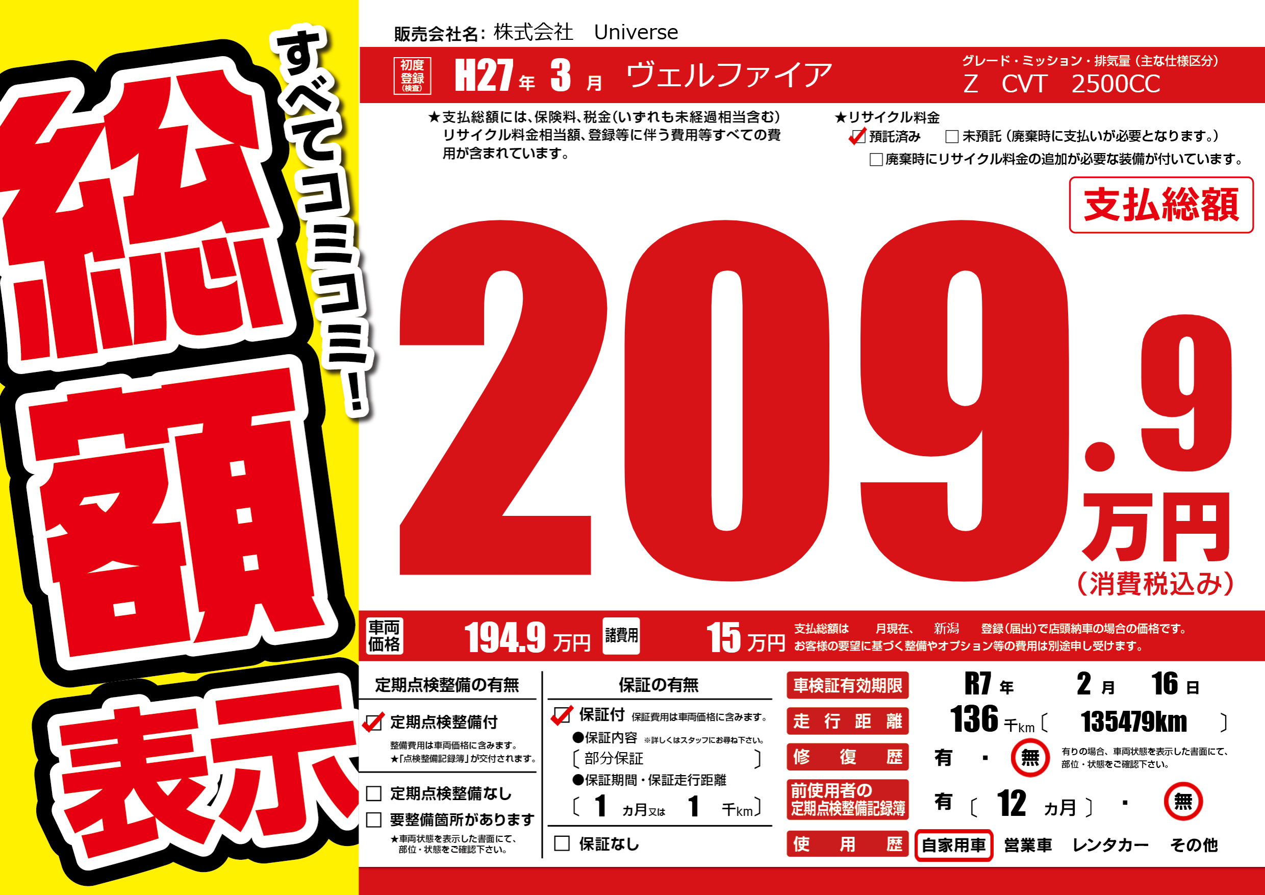 | 走行キロ | 13.6万km | 初年度登録 | H27年3月 |