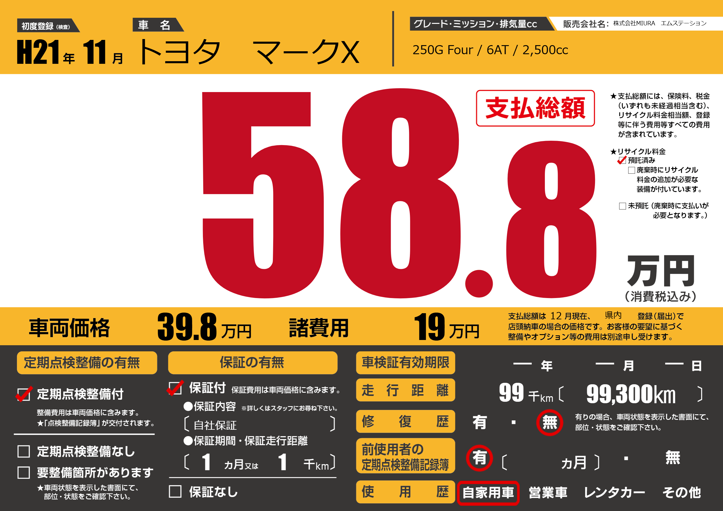 | 車名 | トヨタ マークX | グレード ミッション 排気量 |