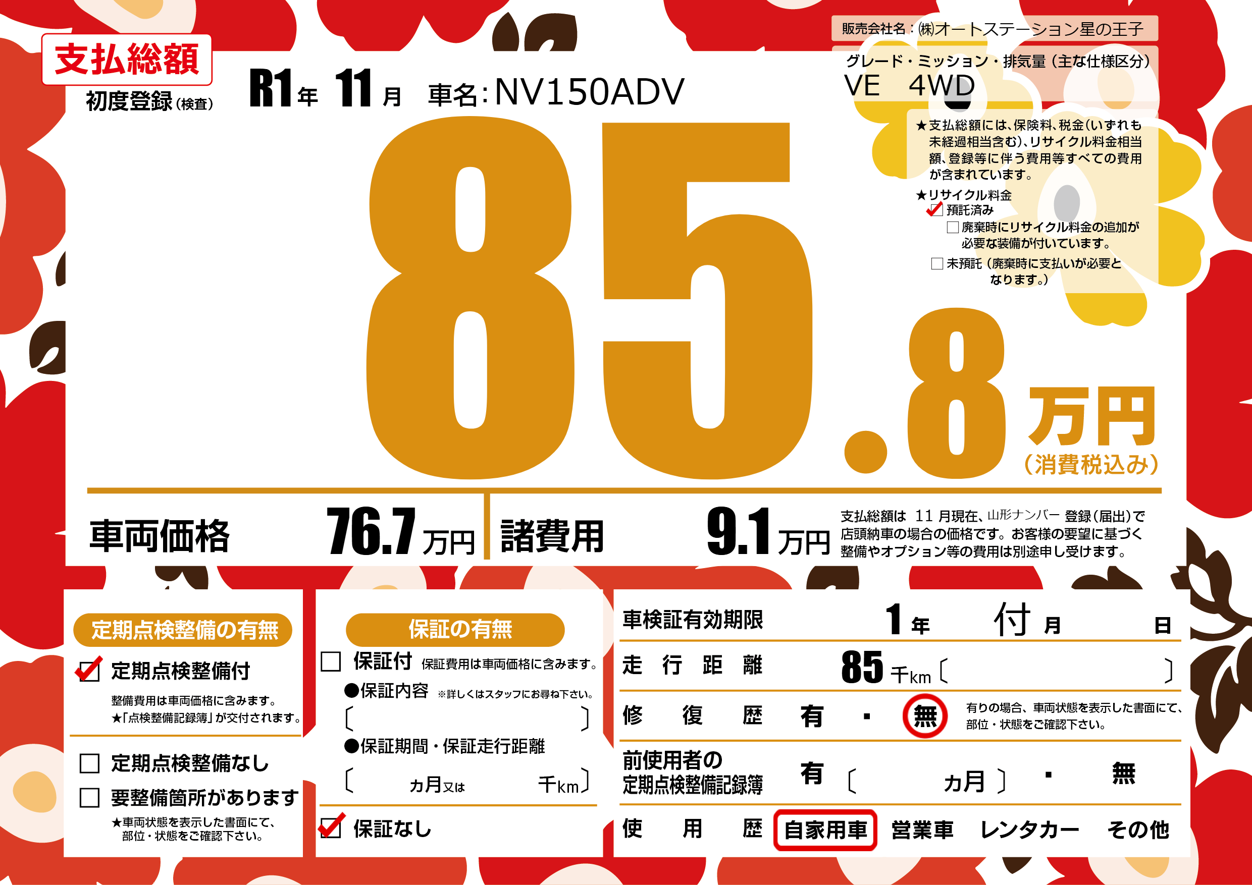 | 走行キロ | 8.5万km | 初年度登録 | R1年11月 |