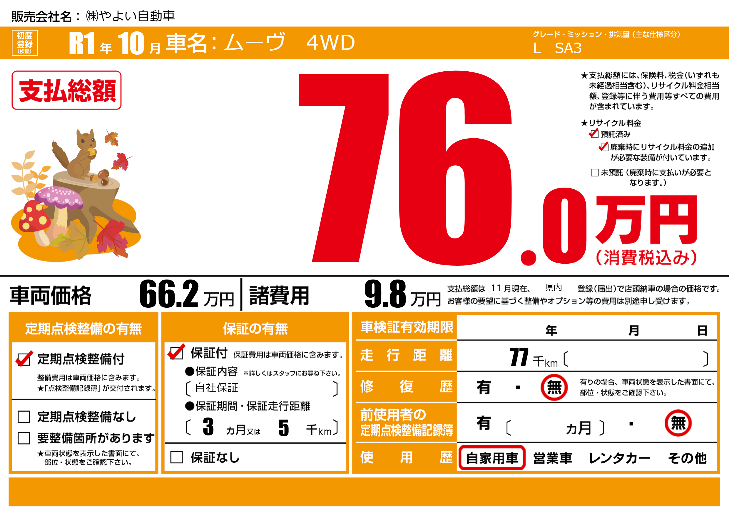 | 車名 | ムーヴ 4WD | グレード ミッション 排気量 |
