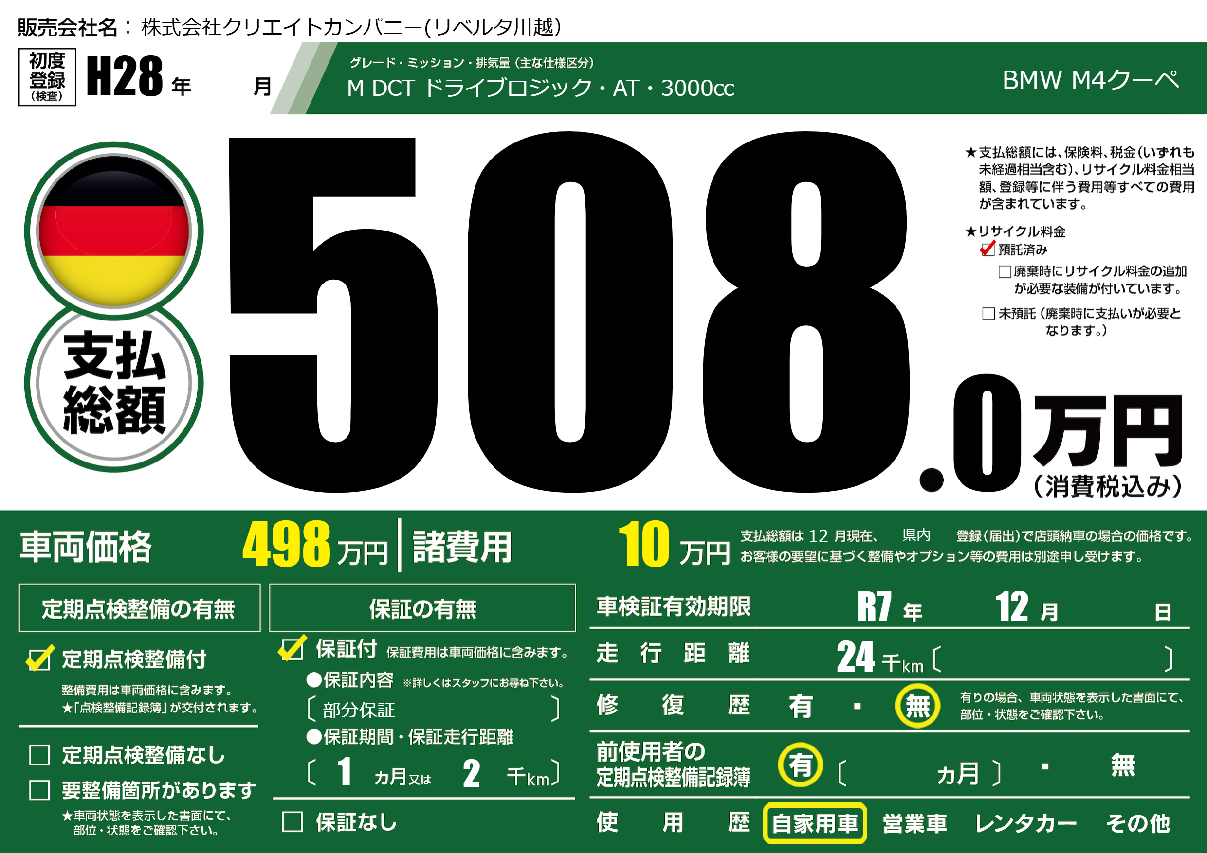 | 車名 | BMW M4クーペ | グレード ミッション 排気量 |