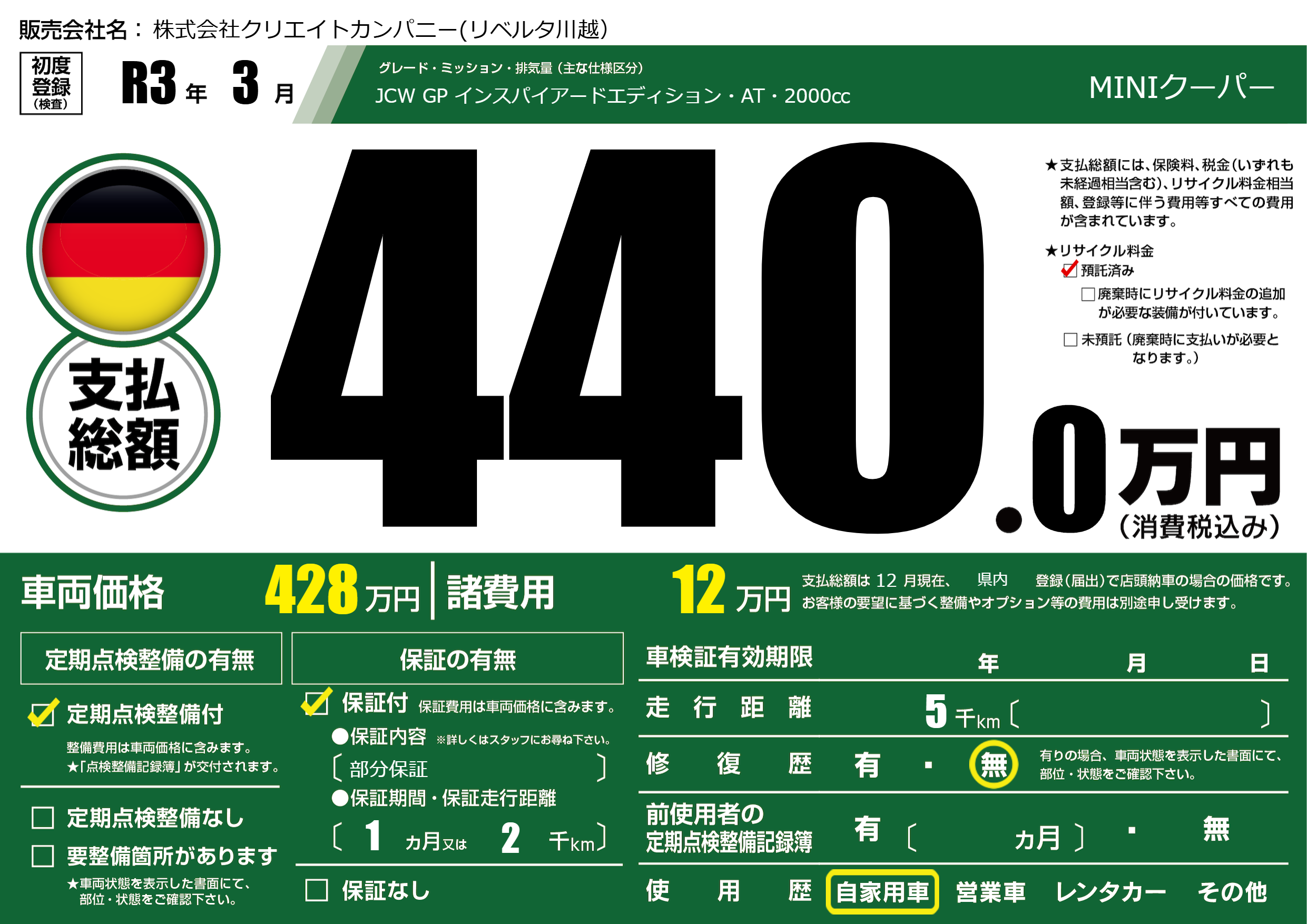 | 車検制限 | - 年 - 月 - 日 | ||
