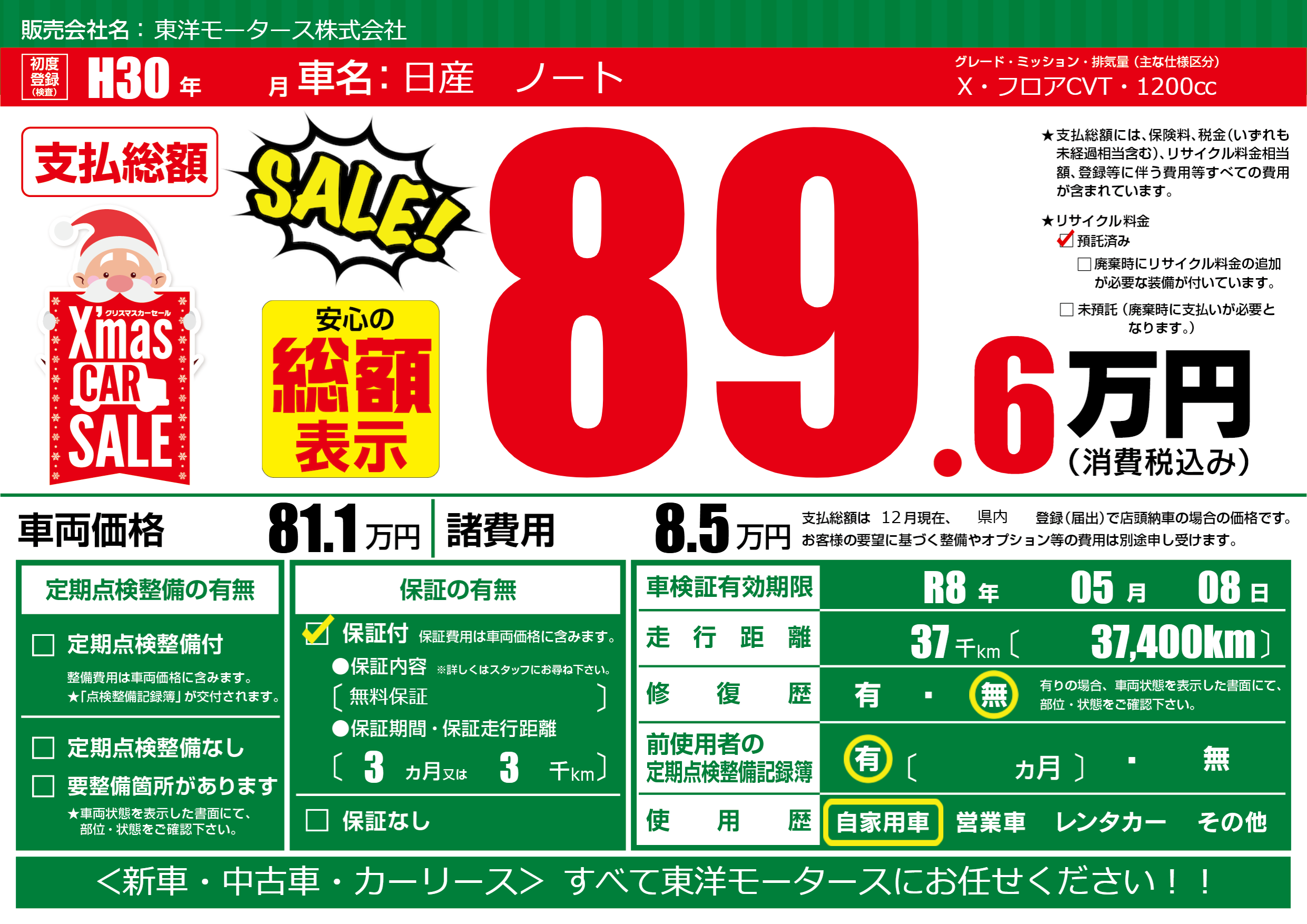 | 車名 | 日産 ノート | グレード ミッション 排気量 |