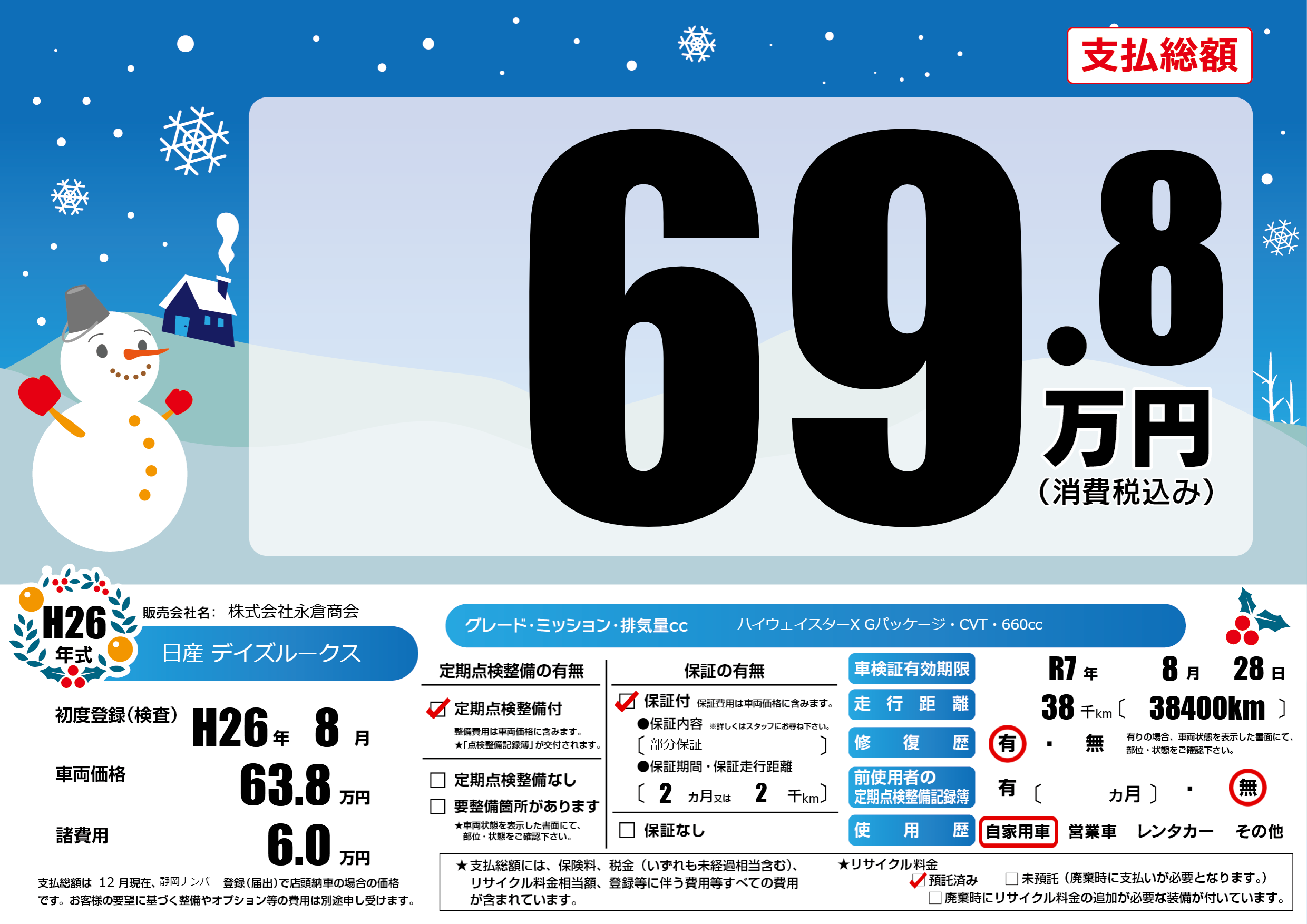 | 走行キロ | 3.8万km | 初年度登録 | H26年8月 |
