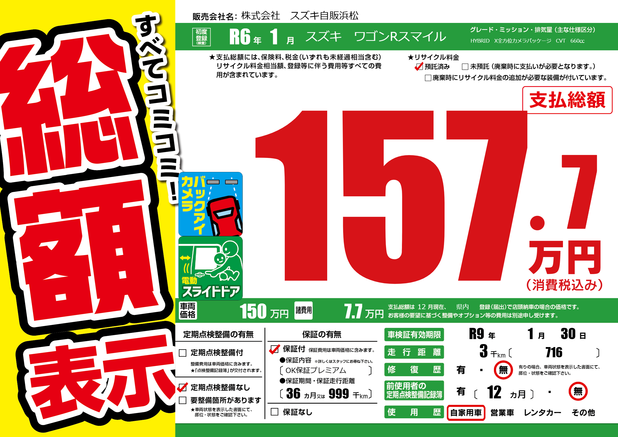 | 走行キロ | 0.3万km | 初年度登録 | R6年1月 |