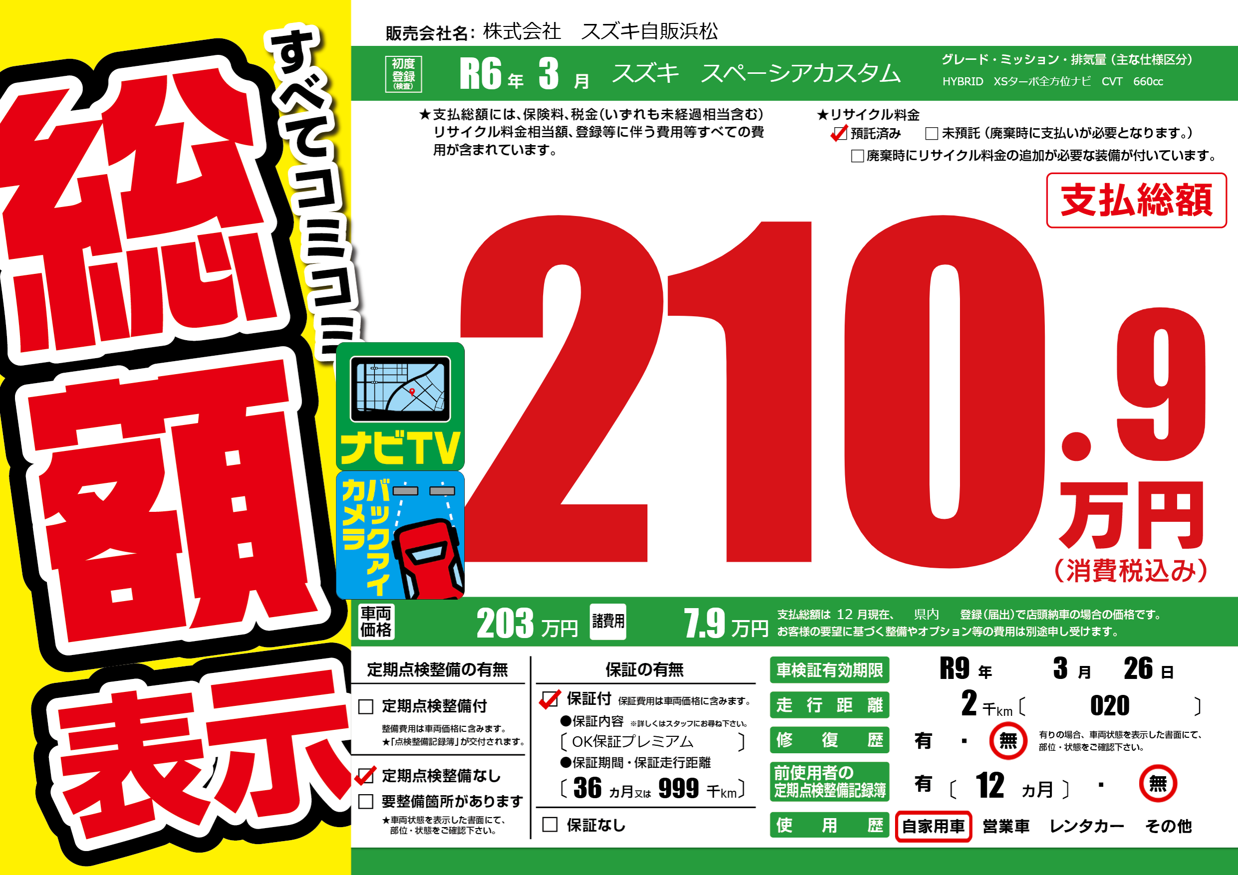 | 車名 | スズキ スペーシアカスタム | グレード ミッション 排気量 |
