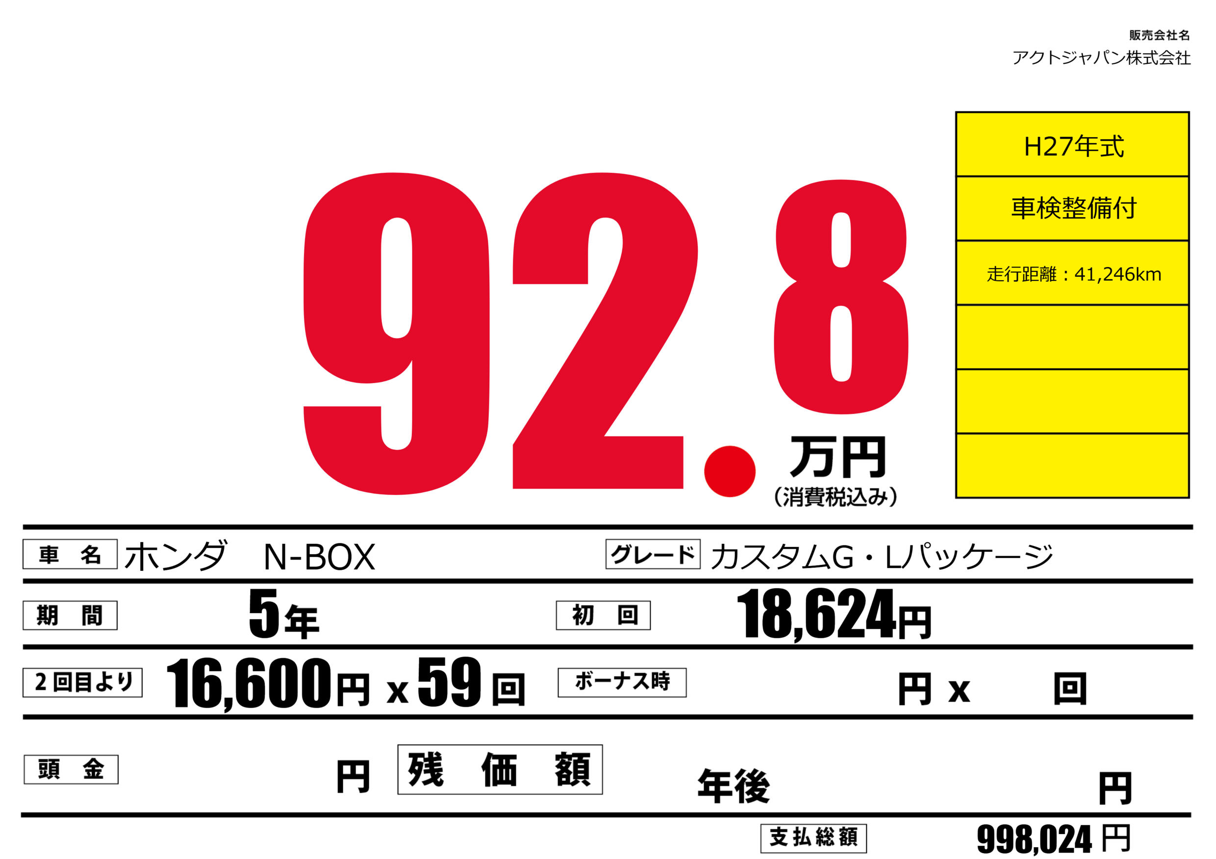 | 車名 | ホンダ N-BOX | グレード ミッション 排気量 |