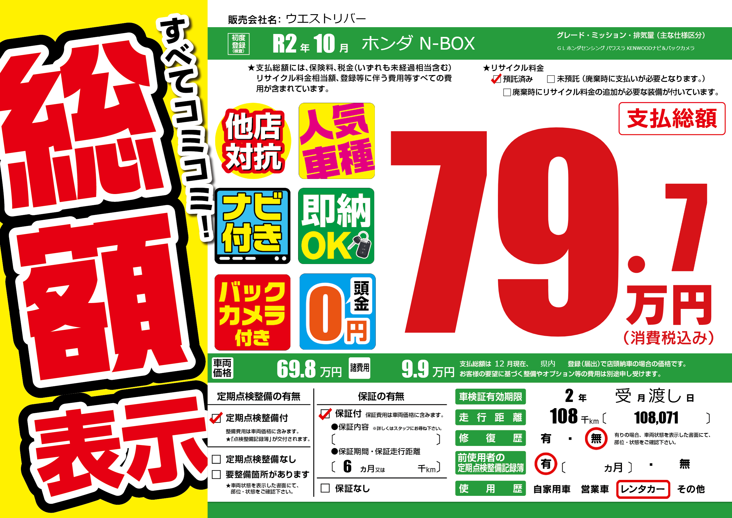 | 車名 | ホンダ N-BOX | グレード ミッション 排気量 |