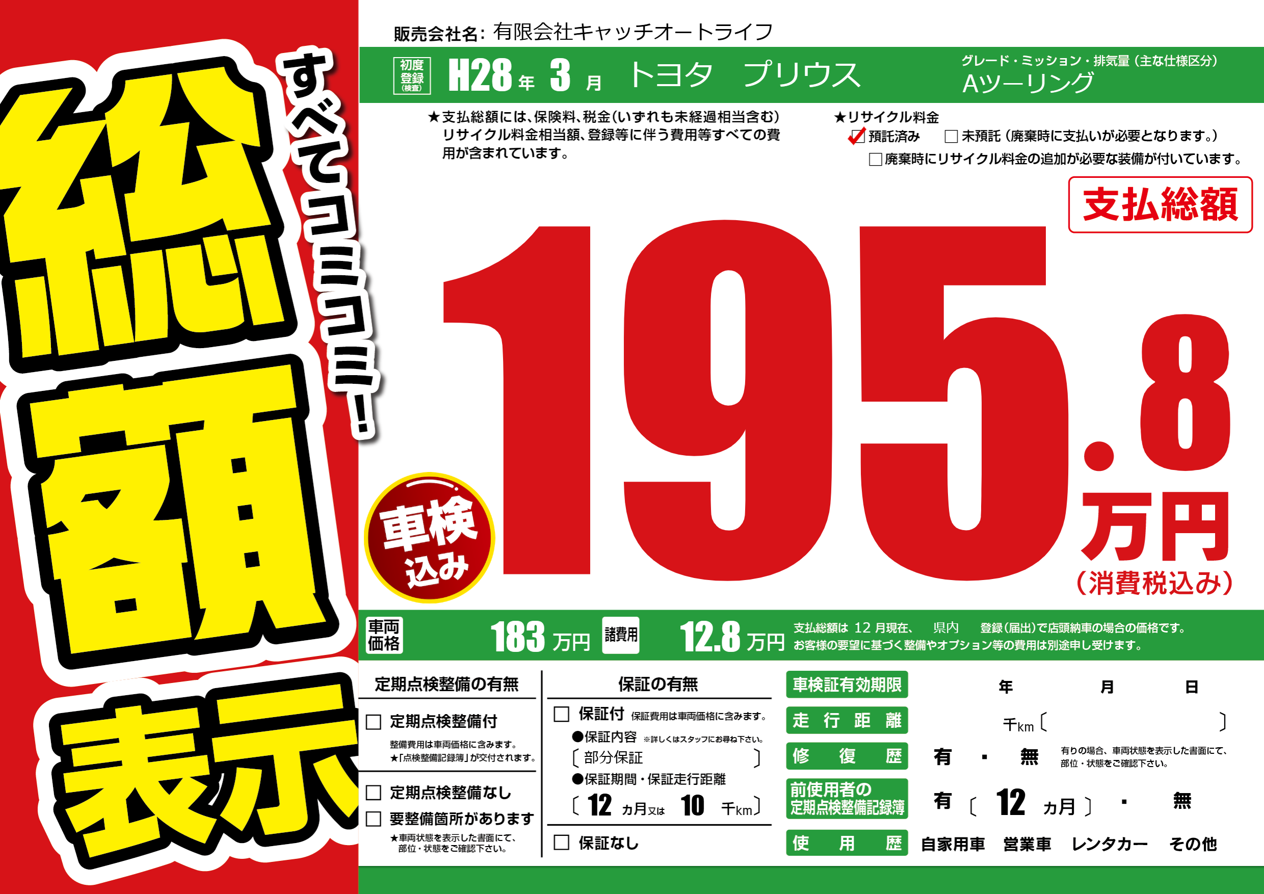 | 車名 | トヨタ プリウス | グレード ミッション 排気量 |