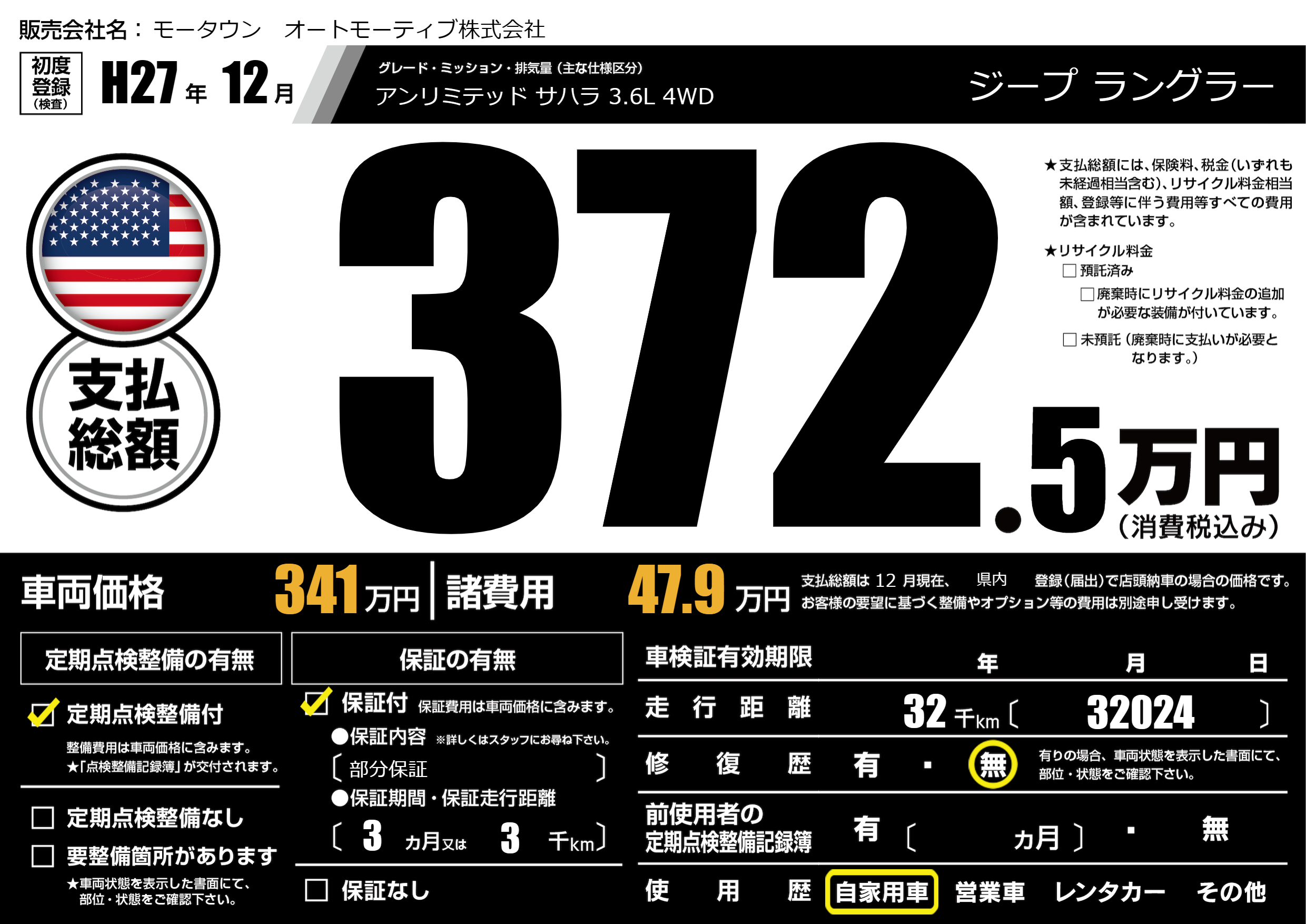 | 車名 | ジープ ラングラー | グレード ミッション 排気量 |
