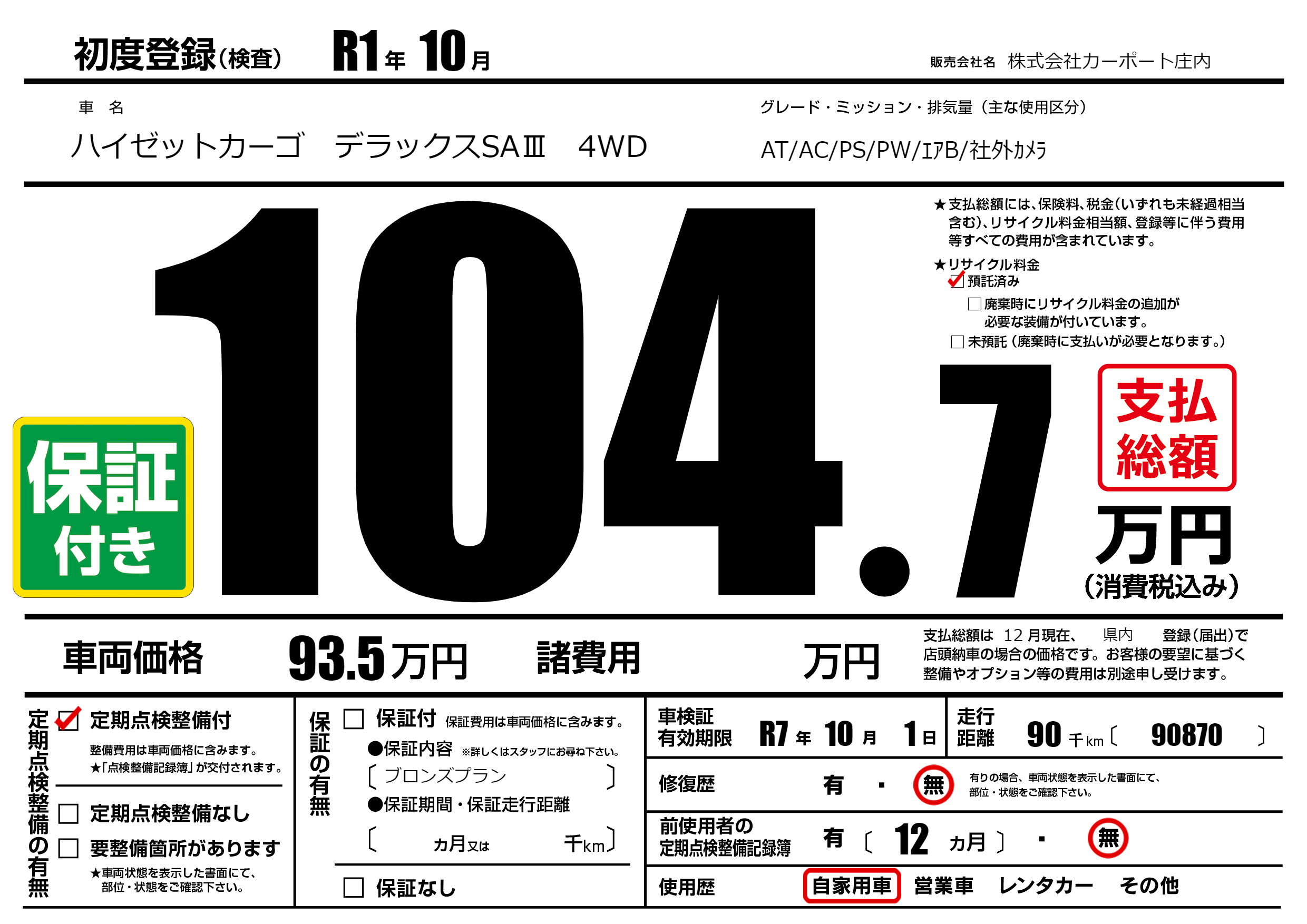 | 車名 | ハイゼットカーゴ デラックスSAⅢ 4WD | グレード ミッション 排気量 |