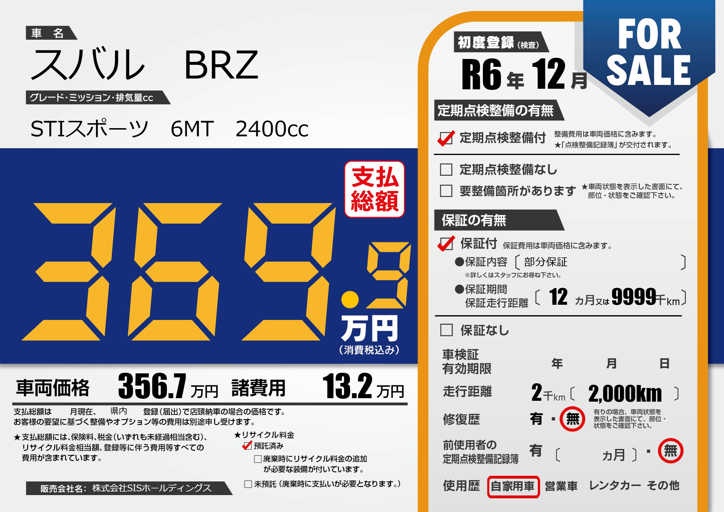 | 車名 | スバル BRZ | グレード ミッション 排気量 |