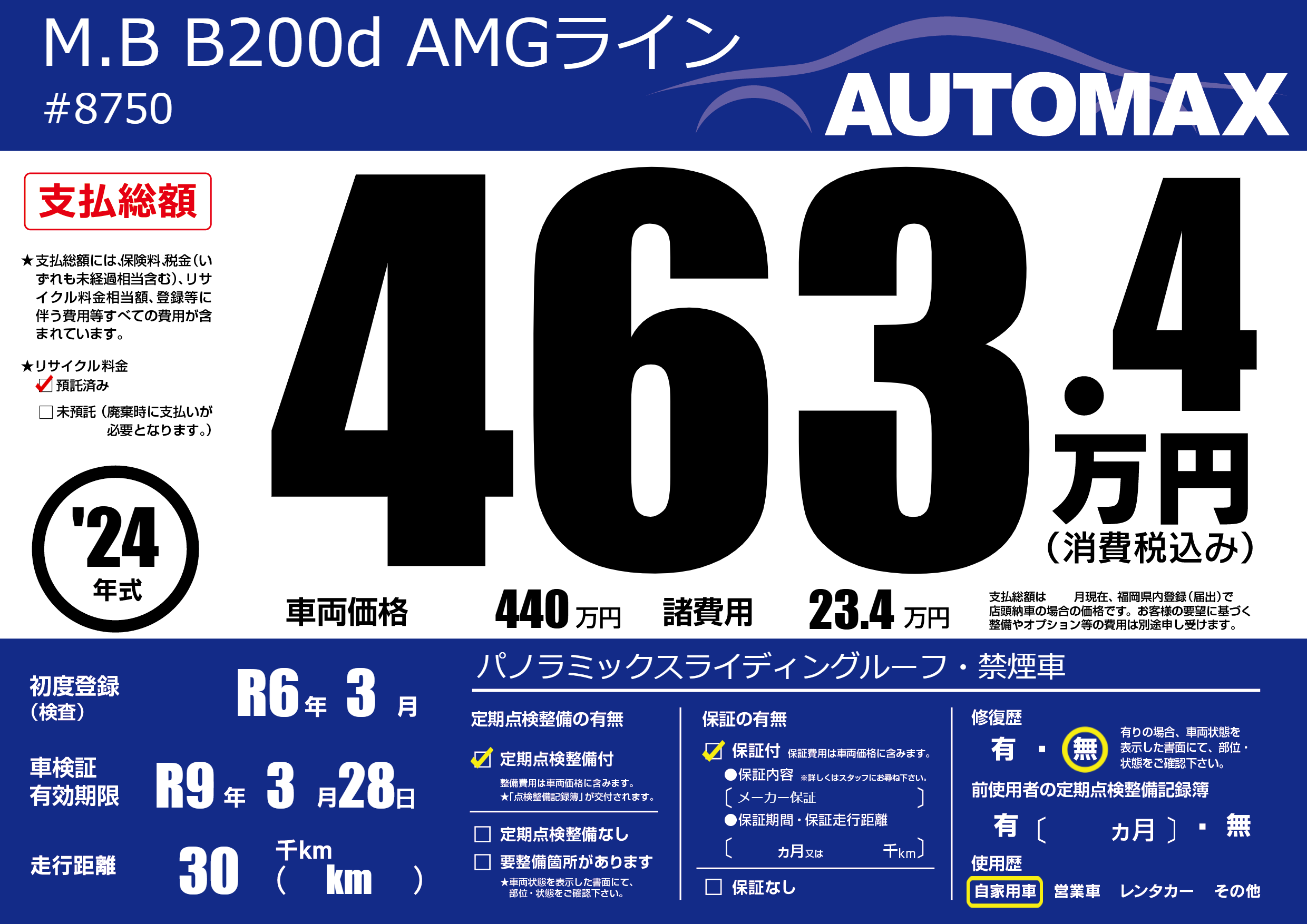 | 車名 | M.B B200d AMGライン | グレード ミッション 排気量 |