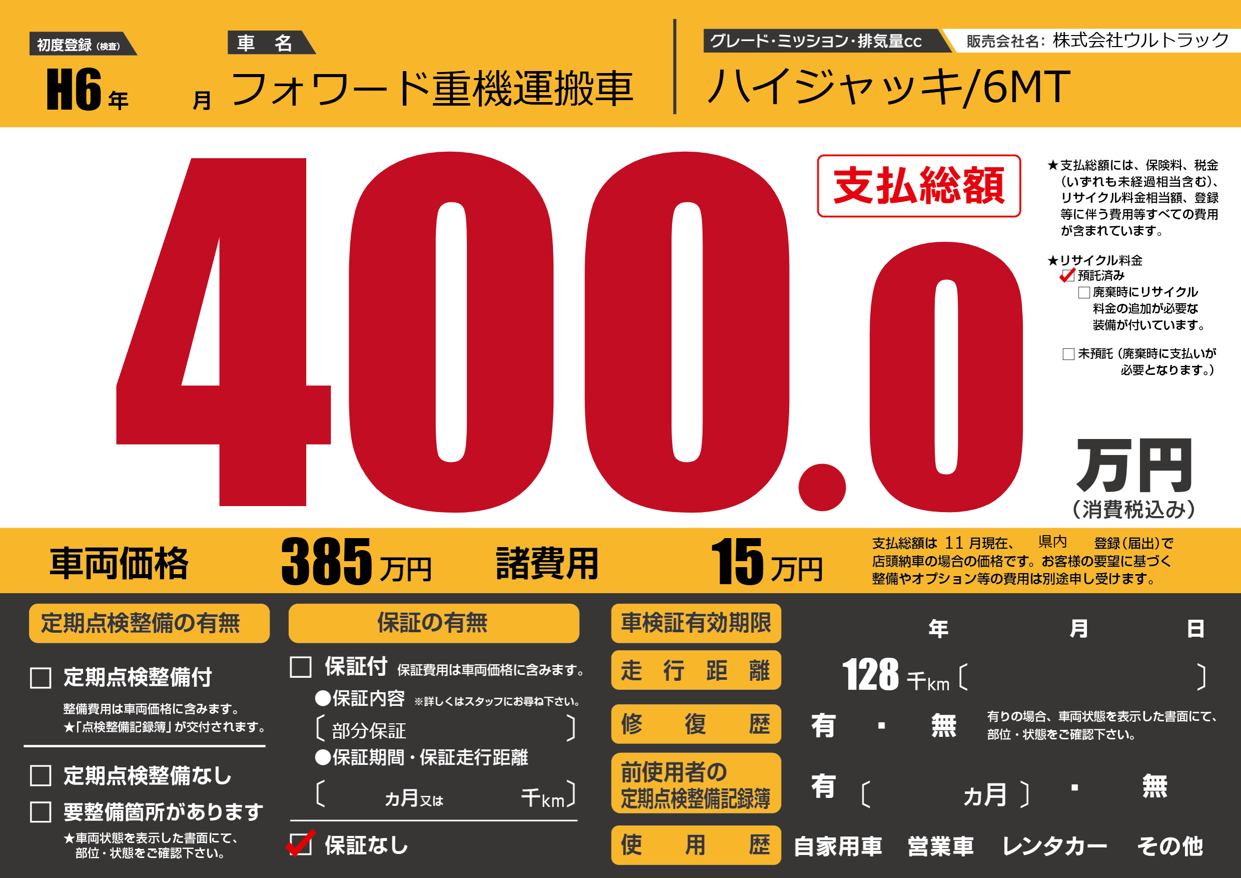 | 走行キロ | 12.8万km | 初年度登録 | H6年---月 |