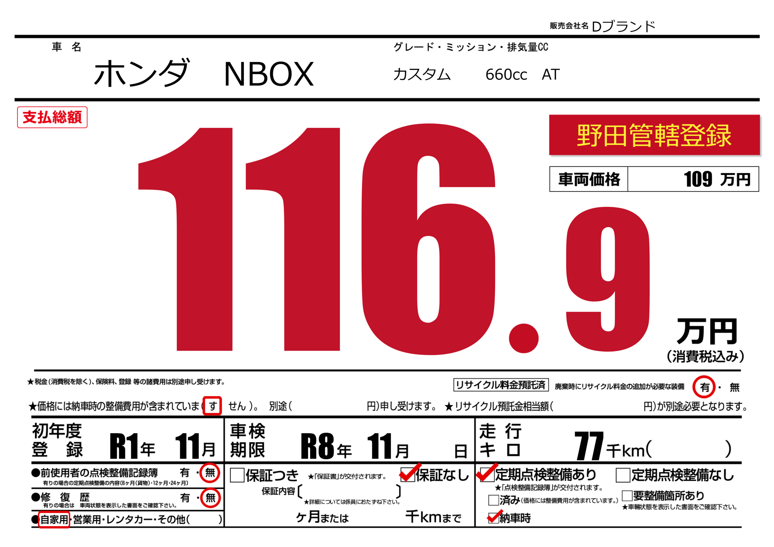 | 車名 | ホンダ NBOX | グレード ミッション 排気量 |