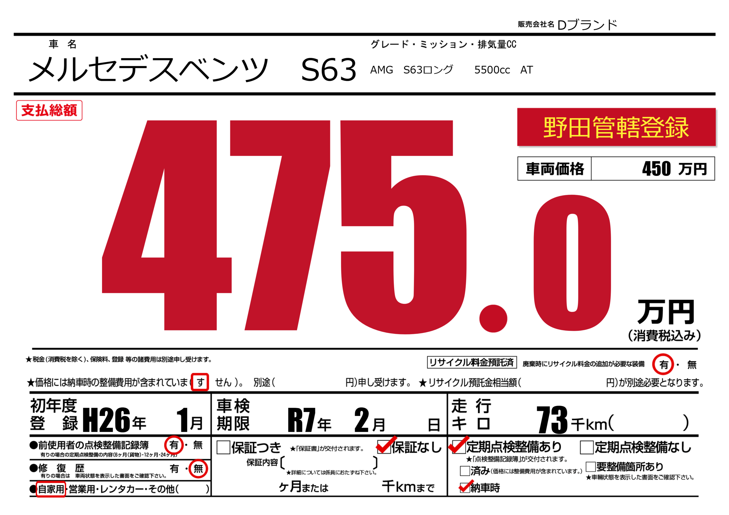 | 車名 | メルセデスベンツ S63 | グレード ミッション 排気量 |