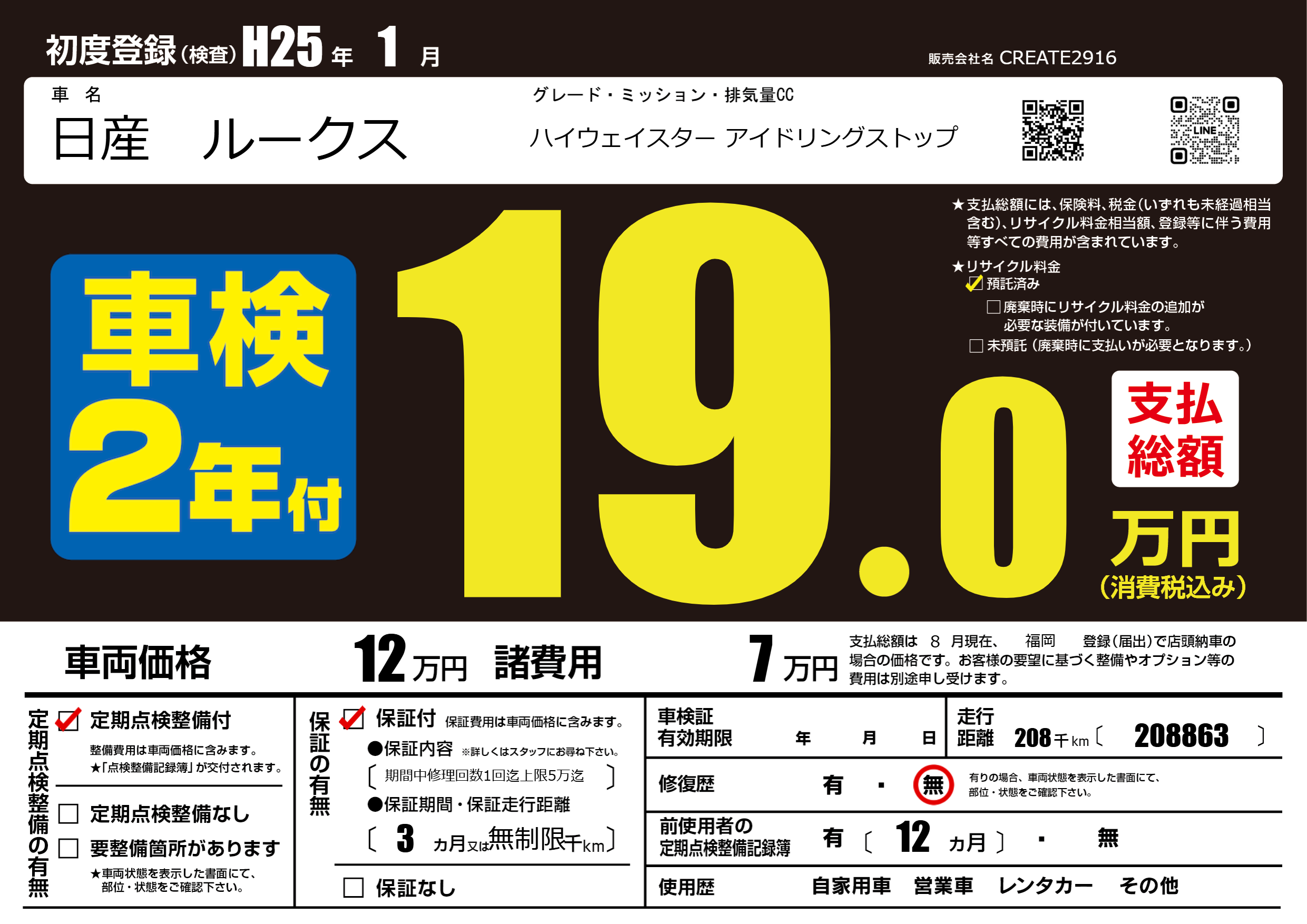 | 走行キロ | 20.8万km | 初年度登録 | H25年1月 |