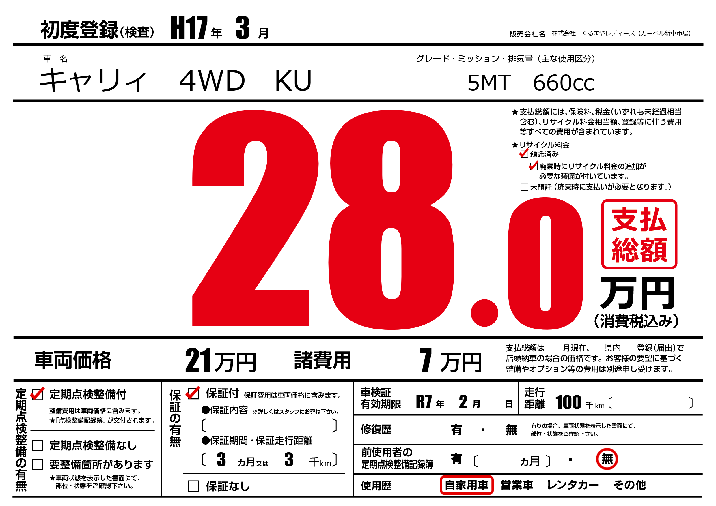 保証付き 保証内容(---) 3ヶ月または(3)千kmまで |