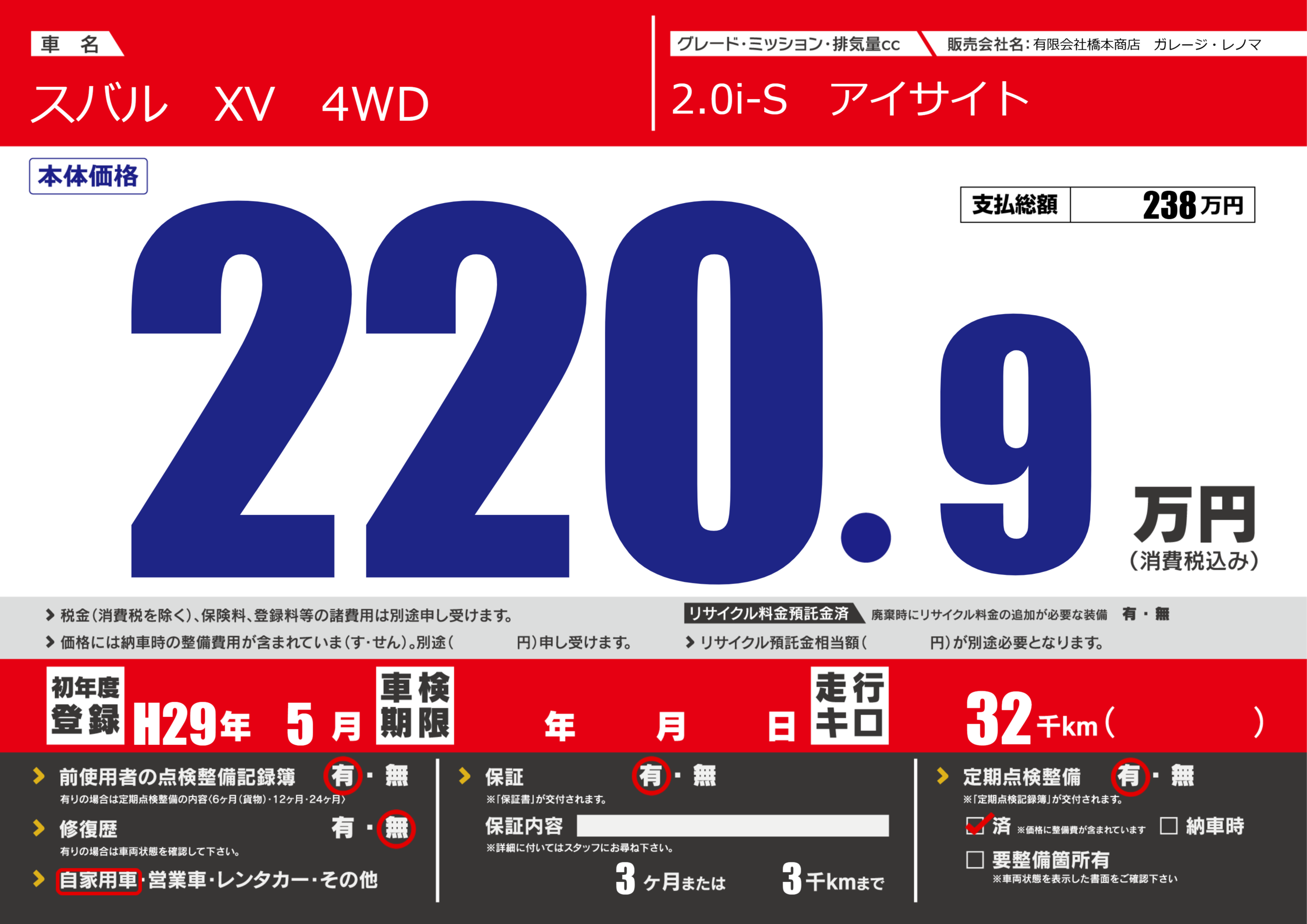| 定期点検整備 | 定期点検整備あり 定期点検整備済み | ||