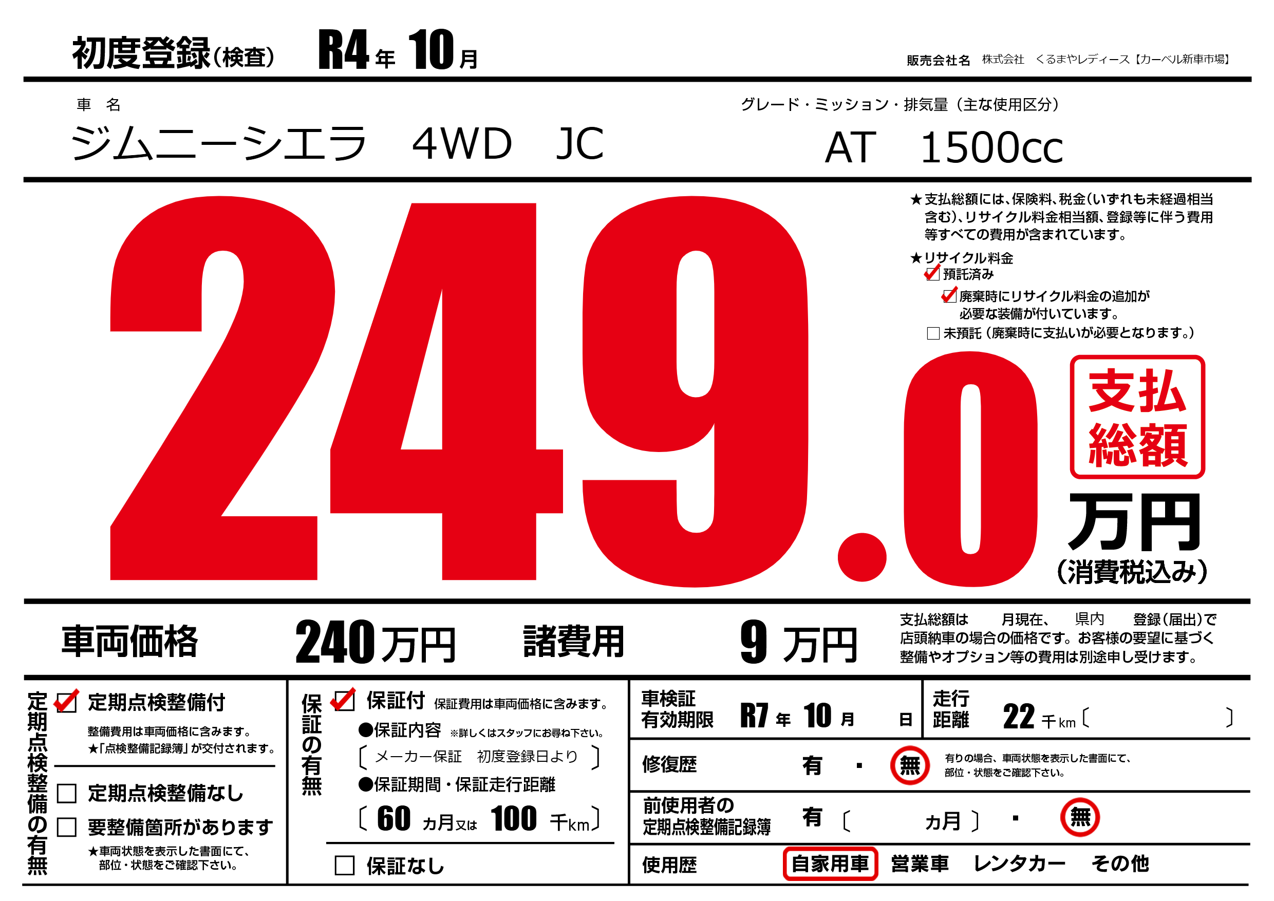 | 走行キロ | 2.2万km | 初年度登録 | R4年10月 |