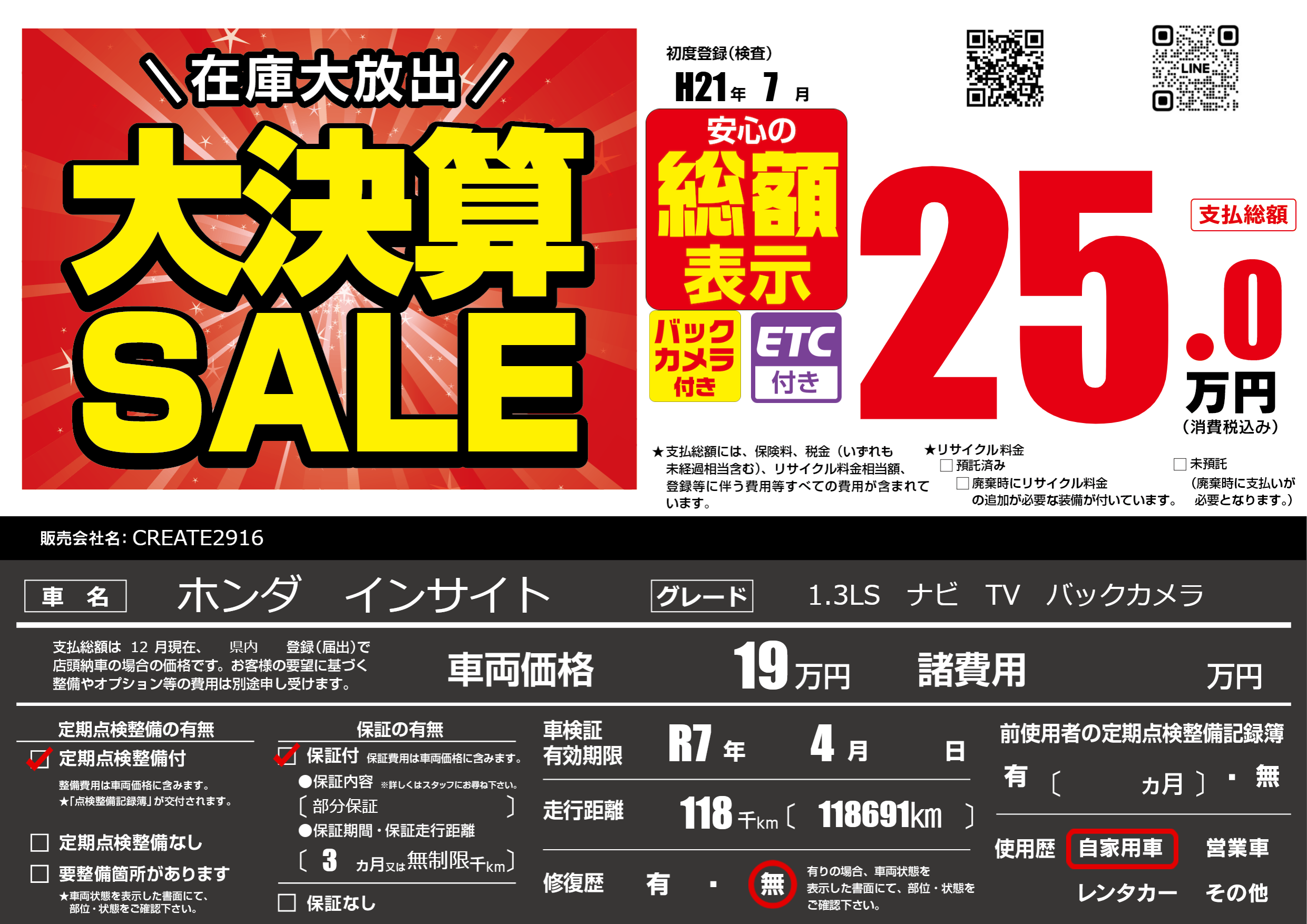 | 走行キロ | 11.8万km | 初年度登録 | H21年7月 |