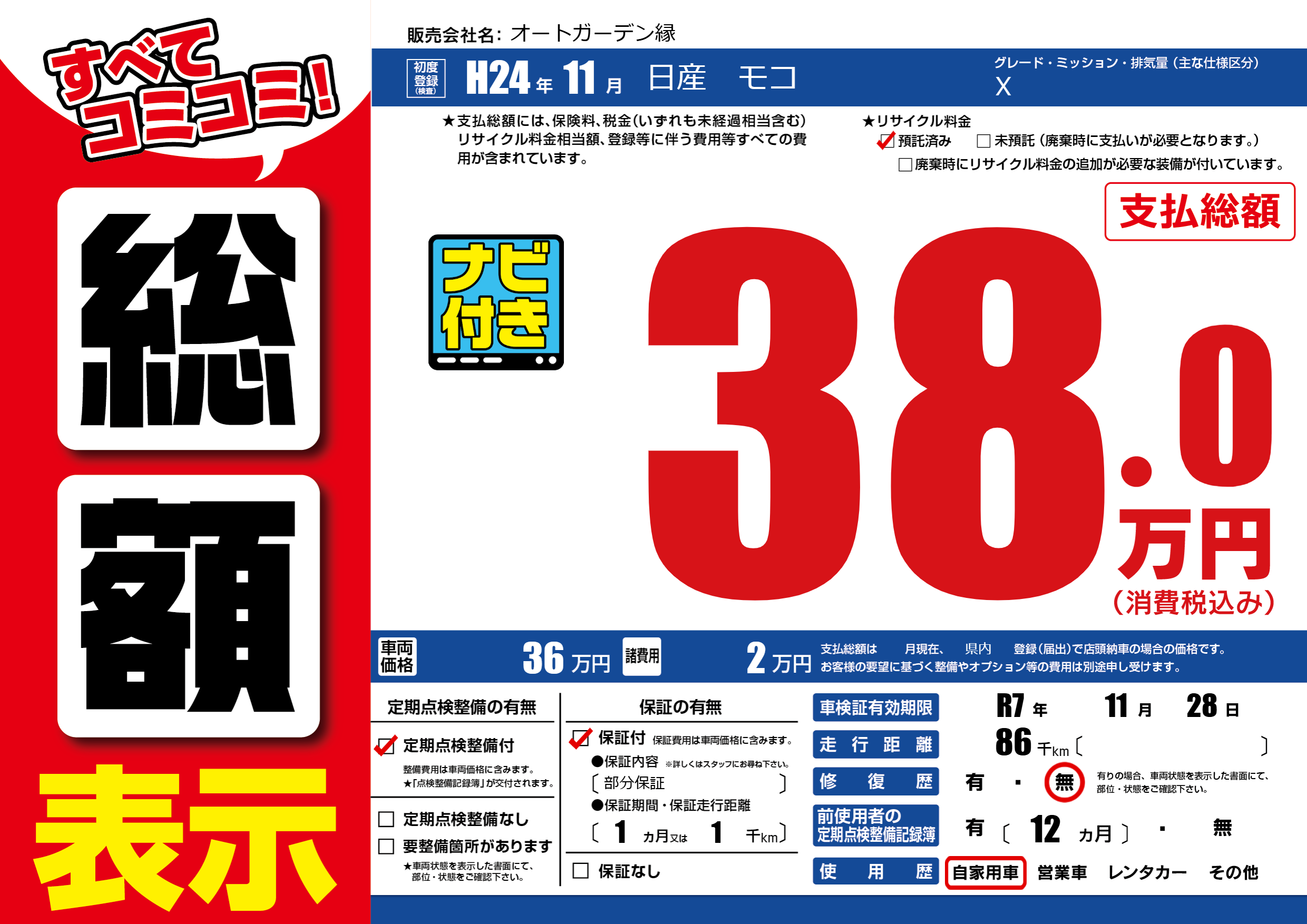| 車名 | 日産 モコ | グレード ミッション 排気量 |