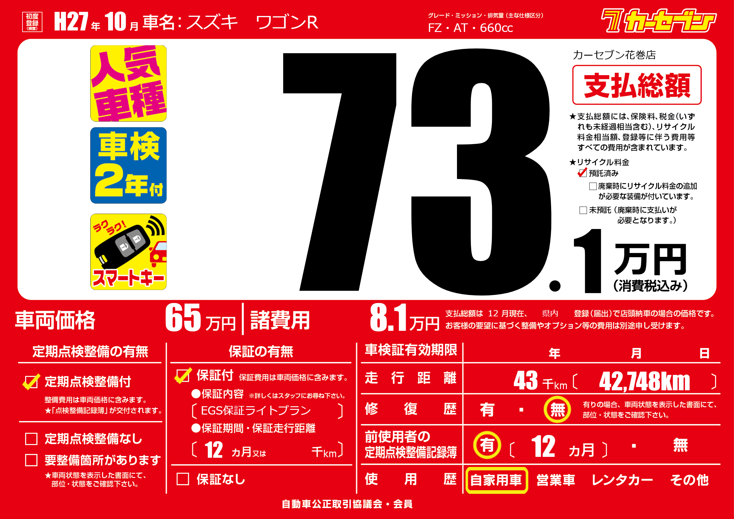 | 車名 | スズキ ワゴンR | グレード ミッション 排気量 |