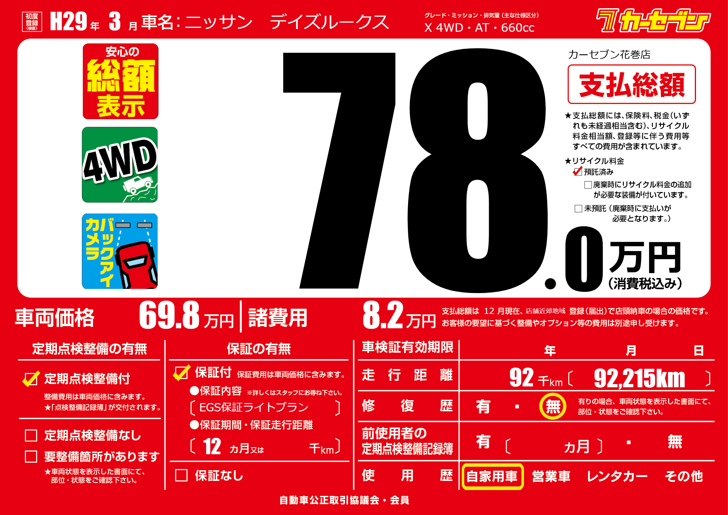 保証付き 保証内容(EGS保証ライトプラン) 12ヶ月または()千kmまで |