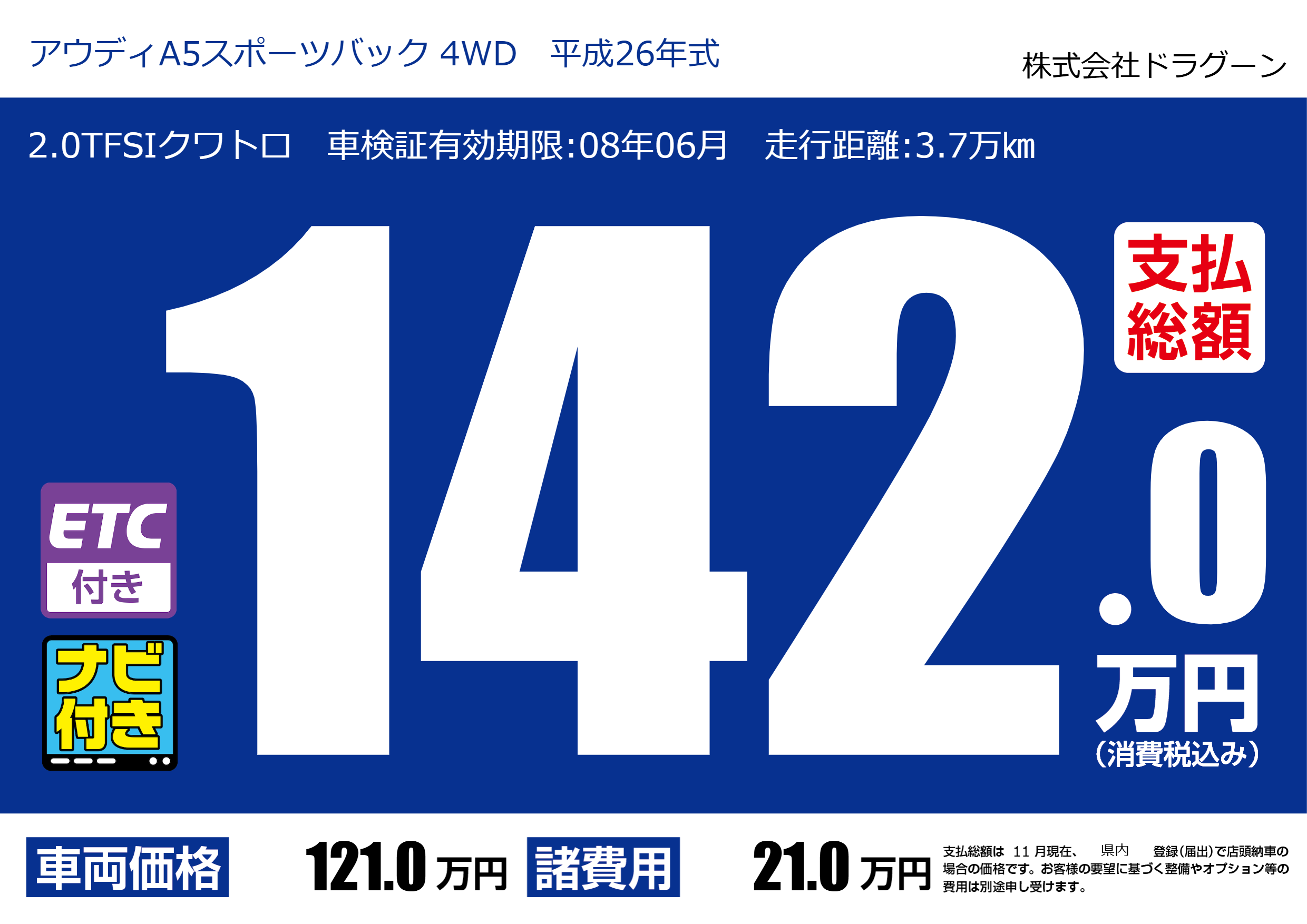 | 車名 | アウディA5スポーツバック 4WD 平成26年式 | グレード ミッション 排気量 |