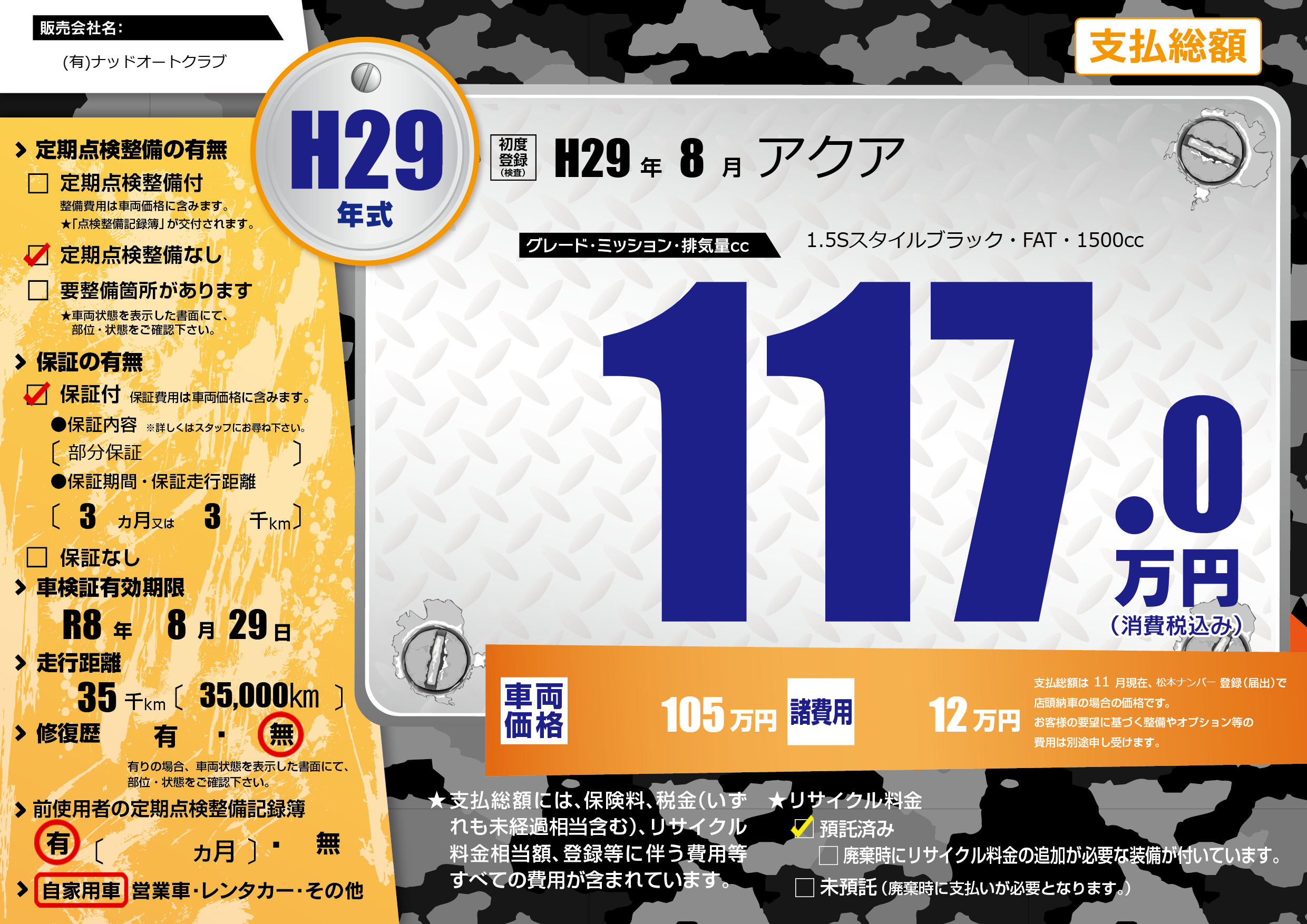 | 走行キロ | 3.5万km | 初年度登録 | H29年8月 |